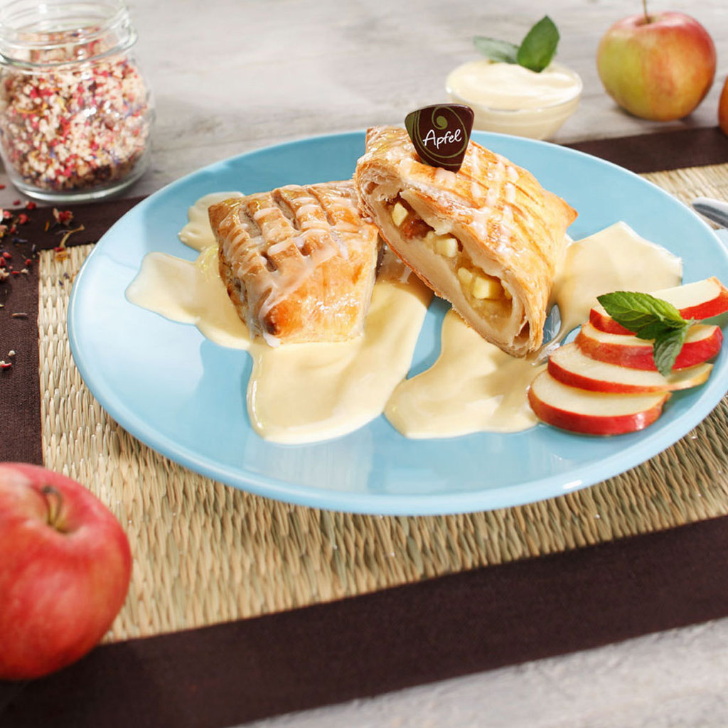 Fruchtiger Strudelgenuss mit einer leckeren Apfelfüllung aus frisch geschälten Äpfeln, Sultaninen und edlen Gewürzen in einem Blätterteig. Ideal als Dessert, zum Eis oder auch mit Sahne.
