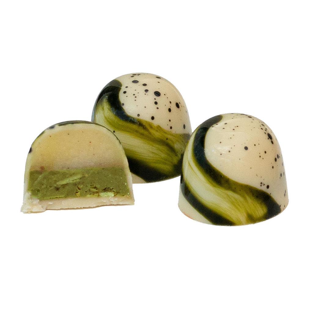 Der Steirer Vanille-Traum in weißer Schokolade kombiniert feine Vanilleganache mit aromatischen Kürbiskernen zu einer harmonischen Pralinenkomposition. Die sanfte Vanillenote und der nussige Geschmack der Kürbiskerne ergänzen sich perfekt und sorgen für ein ausgewogenes, cremiges Genusserlebnis. Die edle, glänzende Oberfläche verleiht der Praline zudem eine besonders ansprechende Optik – ideal für besondere Dessertkreationen, Pralinensortimente und den professionellen Einsatz in Patisserie und Gastronomie.