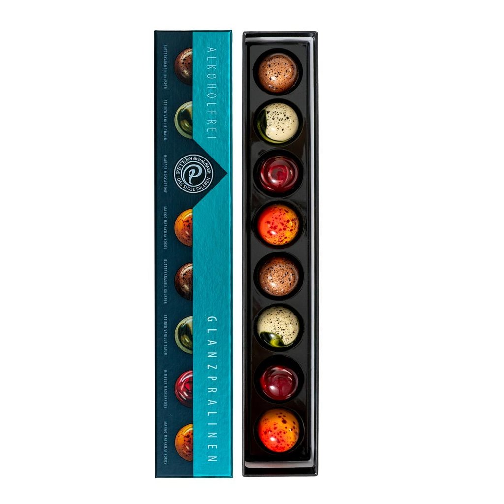 Die Glanzpralinen-Mischung ohne Alkohol vereint handwerkliche Confiserie-Kunst mit kreativer Vielfalt und feinem Geschmack. Jede Praline besticht durch eine glänzende Oberfläche und sorgfältig abgestimmte Füllungen – teilweise doppelt oder dreifach kombiniert – für ein abwechslungsreiches Genusserlebnis. Die elegante Präsentation unterstreicht den hochwertigen Charakter dieser Auswahl und macht sie zum idealen Geschenk oder zum genussvollen Highlight in Patisserie, Hotellerie und Gastronomie.