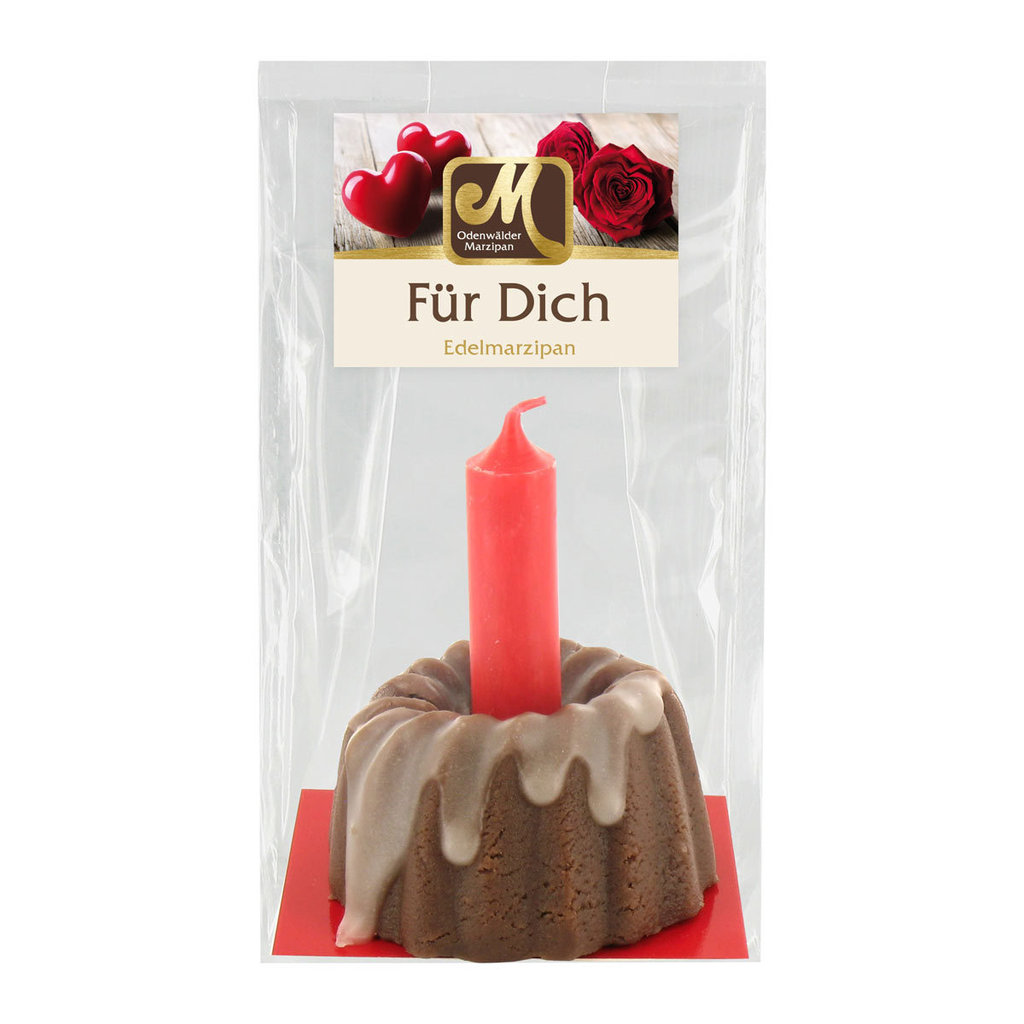 Dieser süße Kuchen aus Edelmarzipan und Kakaopulver ist mit einer feinen Zuckerglasur überzogen. In der Mitte des Gugelhupfs ist eine kleine Kerze.