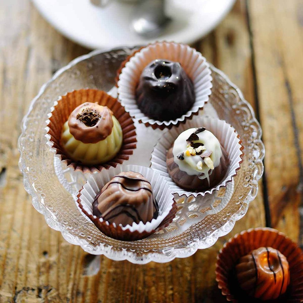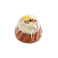 Feinste Cointreau-Praline mit einem Überzug aus hochwertiger Vollmilch- und weißer Schokolade sowie einem Dekor mit Orangenstreuseln und Schokoladenstreuseln.