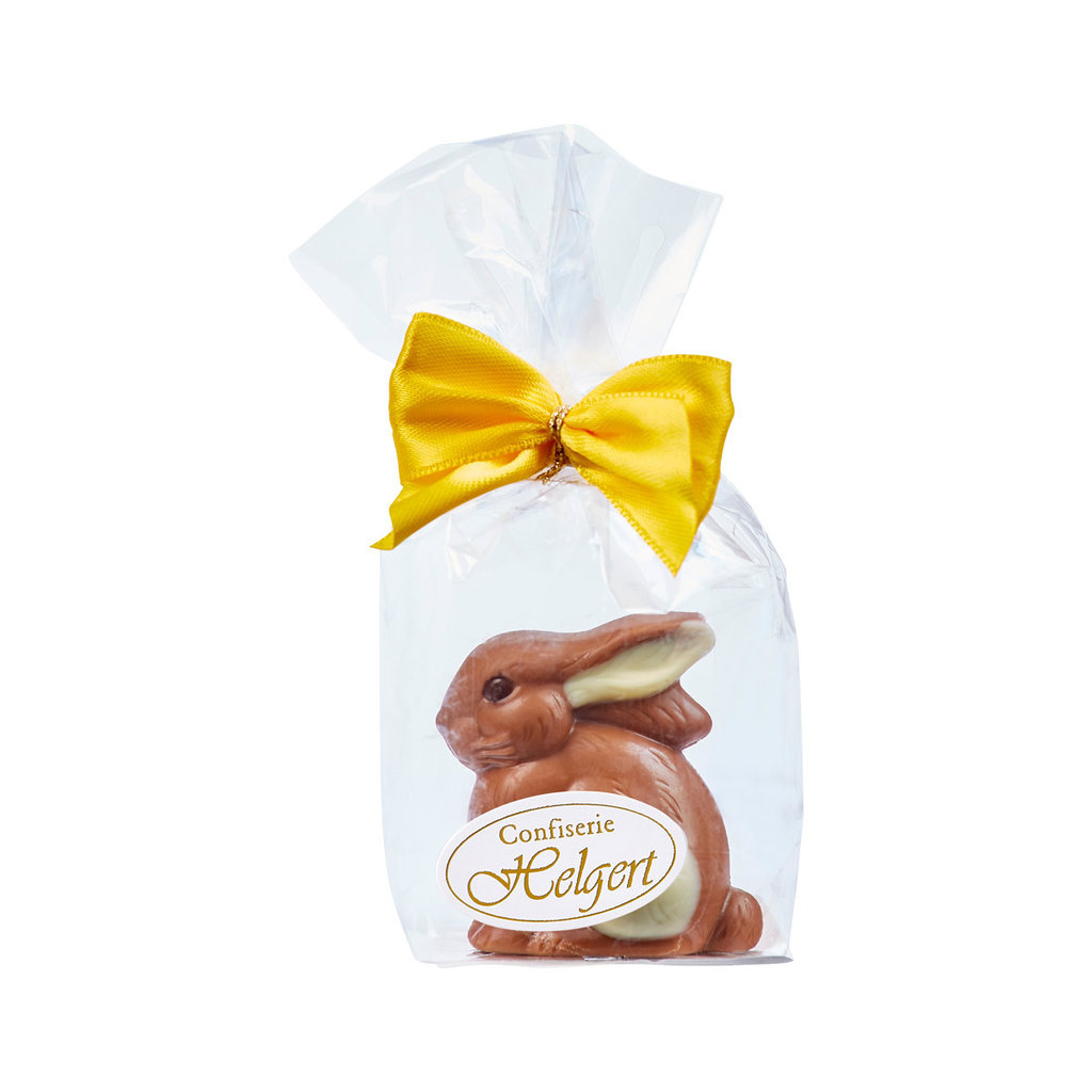 Das Mini-Sitzhäschen aus Vollmilch - und weißer Schokolade wurde mit viel Liebe zum Detail hergestellt. Die Hohlfigur wurde per Hand zur kunstvoll dekorierten Köstlichkeit, die nicht nur Kinderaugen zum Strahlen bringen.