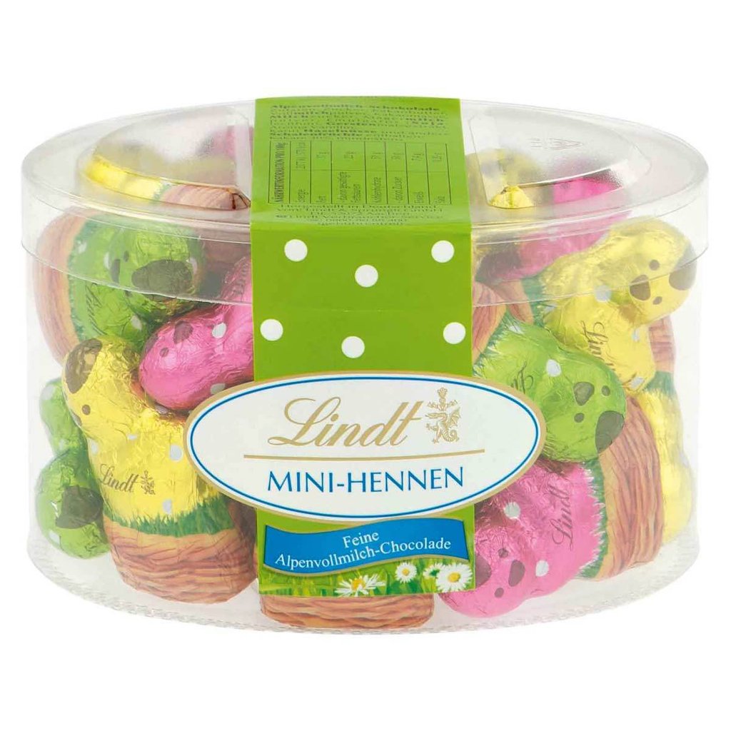 Die Lindt Deko Edition Mini Hennen in buntem Wickelpapier verpackt, sind Figuren aus Alpenmilch Schokolade und ein wahrer Hingucker, der auf der Zunge zergeht.