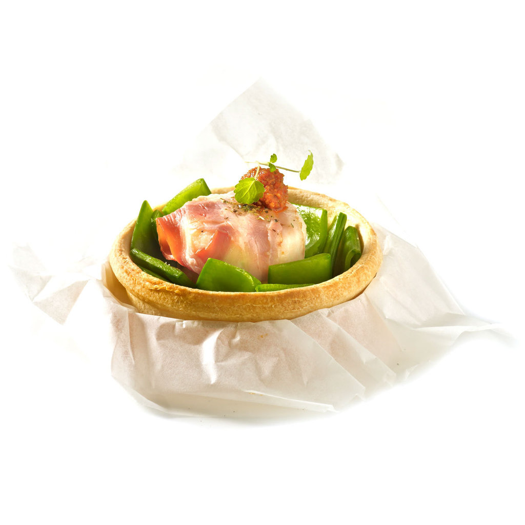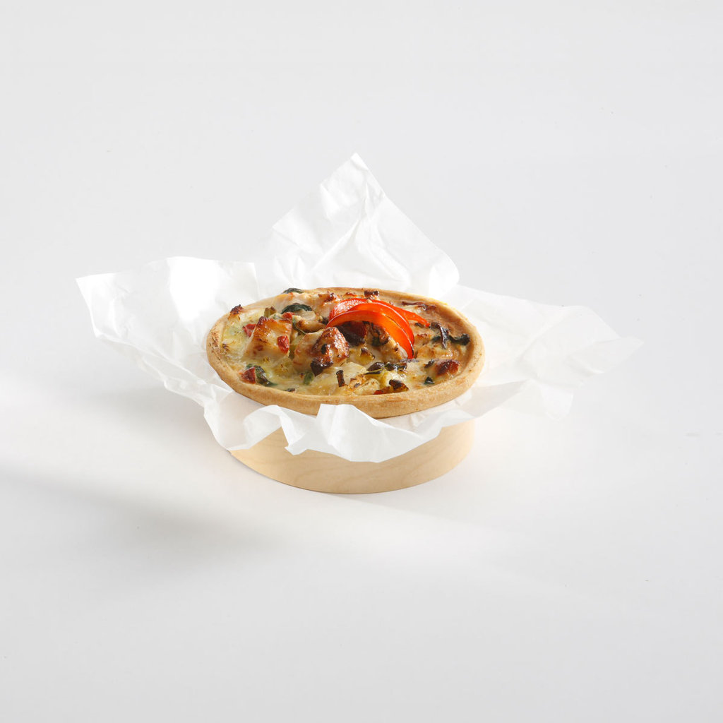 Alle Tartelettes liegen auf einem halbtransparenten Papier in einem stabilen Ring aus fester Pappe in Holzoptik. Sie sind nach dem Befüllen sofort servierbereit, können aber auch gefüllt noch gebacken werden.