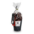 Die im Beutel verpackten Pralinen sind in einem stylischen, schwarzen Becher bruchsicher verpackt.