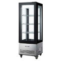 Die Umluftkühlvitrine mit ca. 400 Liter großem Volumen eignet sich zur Präsentation und Kühlung größerer Mengen. Die LED-Innenbeleuchtung lässt Ihre Sandwichs, Obst und Kuchen in besonders gutem Licht erstrahlen. Sie können mit den drei verstellbaren Rosten eine flexible Bestückung vornehmen. Durch die Vier-Seiten-Doppelverglasung wird immer eine perfekte Einsicht auf das Produkt ermöglicht und lässt das Gerät kostensparend und energieeffizient arbeiten. Die vier Lenkrollen erlauben einen variablen Standort - egal ob auf der Terrasse, im Speiseraum oder an der Bar.