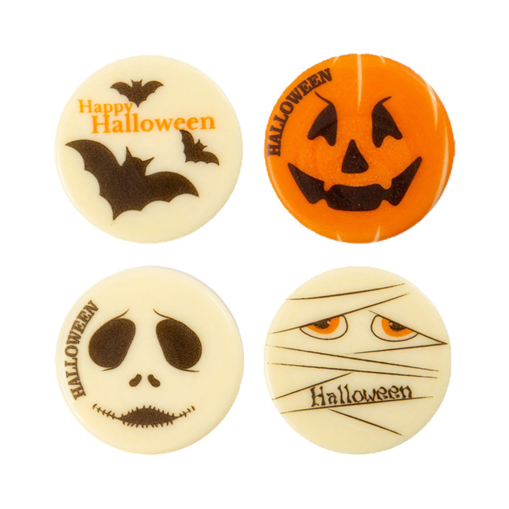 Zartschmelzende Aufleger aus weißer Schokolade, bedruckt mit vier verschiedenen Halloween-Motiven. Ideal zur Dekoration von Muffins, Cupcakes, Torten oder Desserts. Einfach anzuwenden – für kreative, saisonale Highlights.