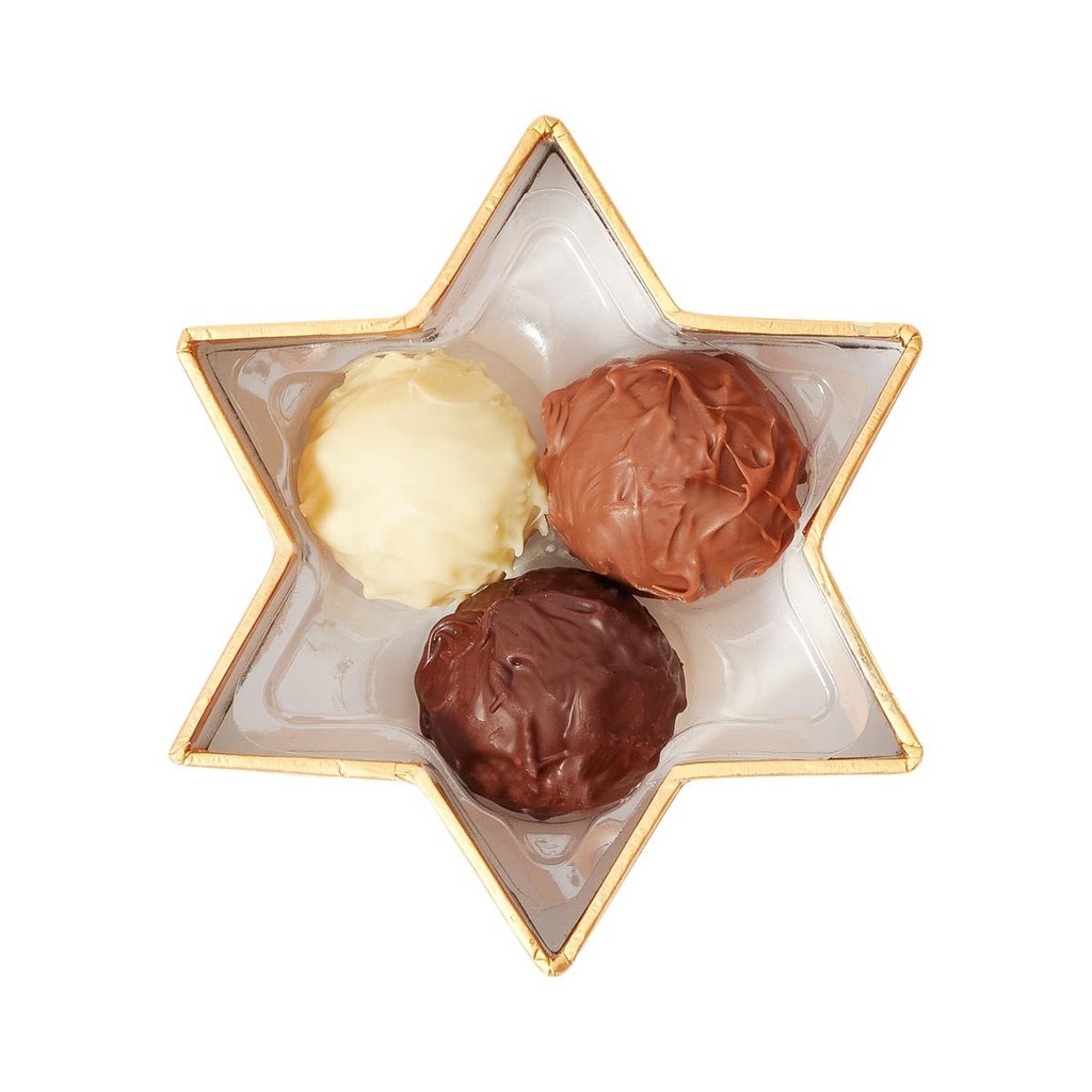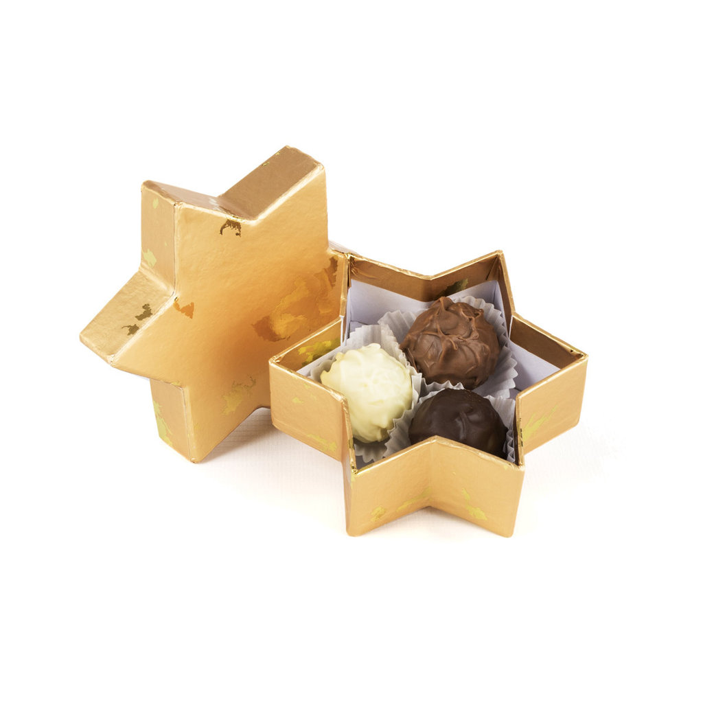 Drei feine Trüffel besonders ansprechend in einer weihnachtlichen Sterne-Box verpackt.