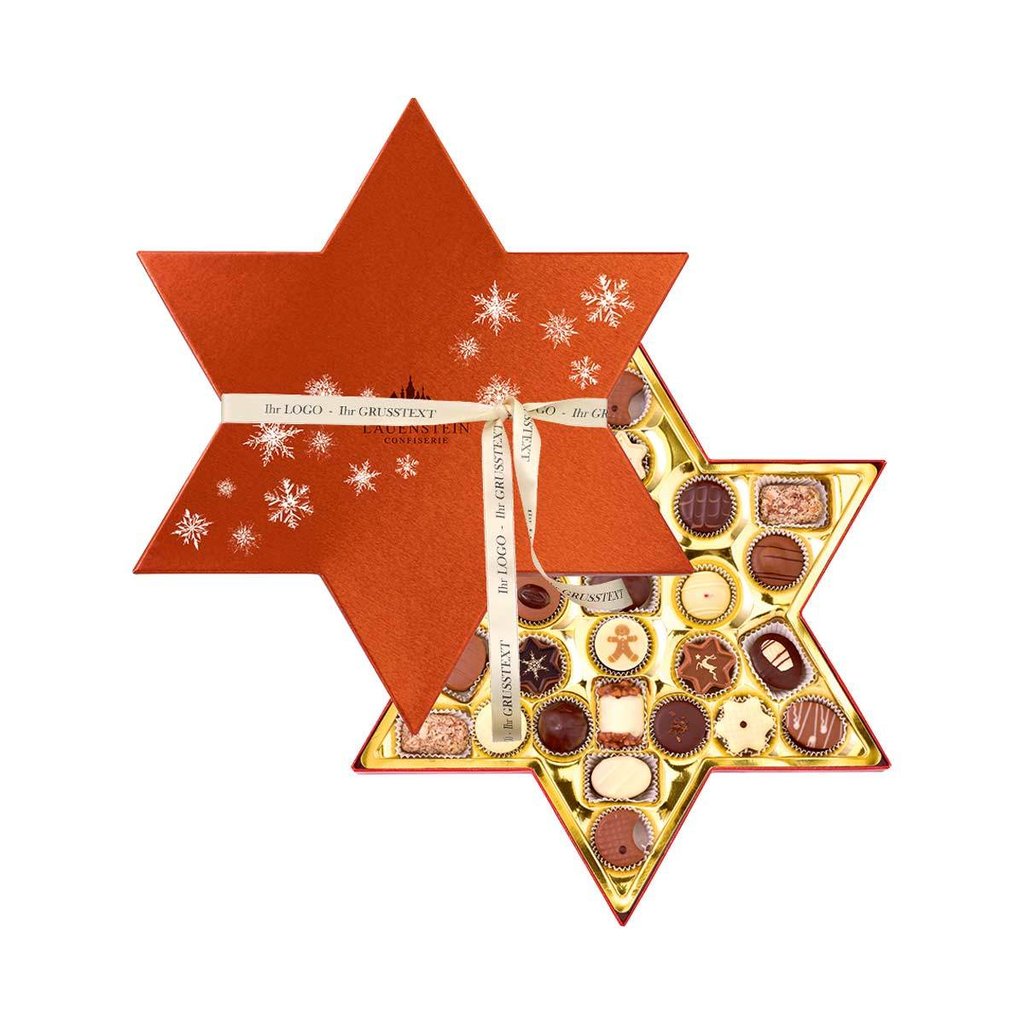 Eine glänzende Geschenkidee - Feinste handgefertigte Trüffel- und Pralinenmischung bestehend aus 24 verschiedenen Sorten in einer festlichen Kartonage in Stern-Optik.