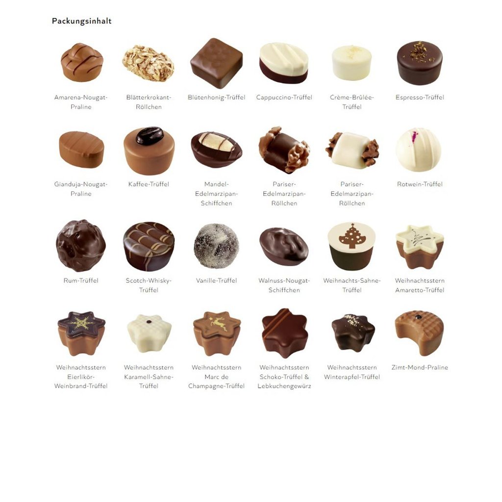 Zucker, Kakaobutter, Kakaomasse, VOLLMILCHPULVER, SAHNE, HASELNÜSSE, MANDELN, WALNÜSSE, MAGERMILCHPULVER, Glukosesirup, BUTTER, Wasser, Weinbrand, BUTTERREINFETT, Feuchthaltemittel Sorbit, Wildkirschen, Blütenhonig, EIERLIKÖR, MANDELLIKÖR, Invertzuckersirup, Emulgator SOJALECITHINE, Emulgator Sonnenblumenlecithin, Emulgator Ammoniumphosphatide, Rotwein, Whisky, Jamaica-Rum, Apfelsaft, aus, Apfelsaftkonzentrat, Marc de Champagne, Traubenlikör, Wodka, Zwetschgenwasser, Espresso-Bohnen, (gestoßen), Röstkaffee, Vanilleextrakt, natürliches Aroma, Zimt, (gemahlen), Apfelmark, Säuerungsmittel Citronensäure, Gewürze, SAHNEPULVER, Bourbon-Vanille, färbendes Lebensmittel(Rote Beetesaft), Wildkirschsaft(Konzentrat), Farbstoff Anthocyane, Farbstoff Kurkumin, Farbstoff Calciumcarbonat, Farbstoff Capsanthin, Überzugsmittel Gummi arabicum, Überzugsmittel Schellack, Piment, Macis, Nelken, Anis, Bourbon-Vanilleextrakt, Kardamom, Kakaopulver, Ethylalkohol, Maltodextrin, schwarzes Johannisbeerpulver, modifizierte Stärke, Karottenkonzentrat Kann Spuren enthalten von: andere SCHALENFRÜCHTE |