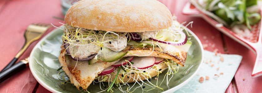 Beide Brötchenhälften mit Sauce bestreichen. Die Unterseiten mit Radieschen und Sprossen bedecken. Mit Fischfilet, Zwiebeln, Gurken und Sprossen belegen und Deckel aufsetzen.
