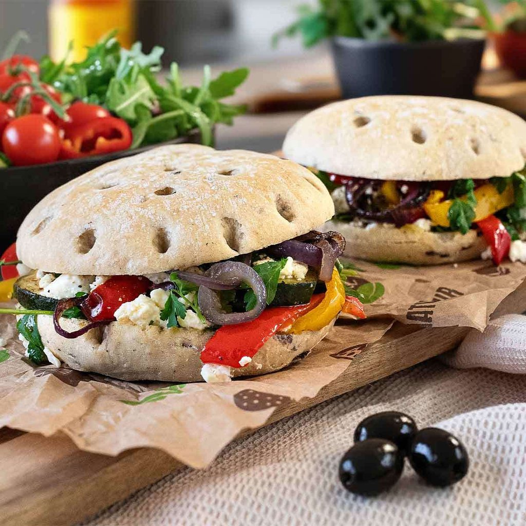 Das handwerkliche Fladenbrot aus feinem Weizenhefeteig sieht dank der vielen eingebackenen Olivenstücke nicht nur gut aus, sondern schmeckt durch ausgewählte Kräuter auch besonders lecker. Mit gegrilltem Gemüse, Tomate-Mozzarella oder mediterranen Wurst- und Käsesorten belegt ist das Brötchen die ideale Grundlage für herzhafte Sandwiches.