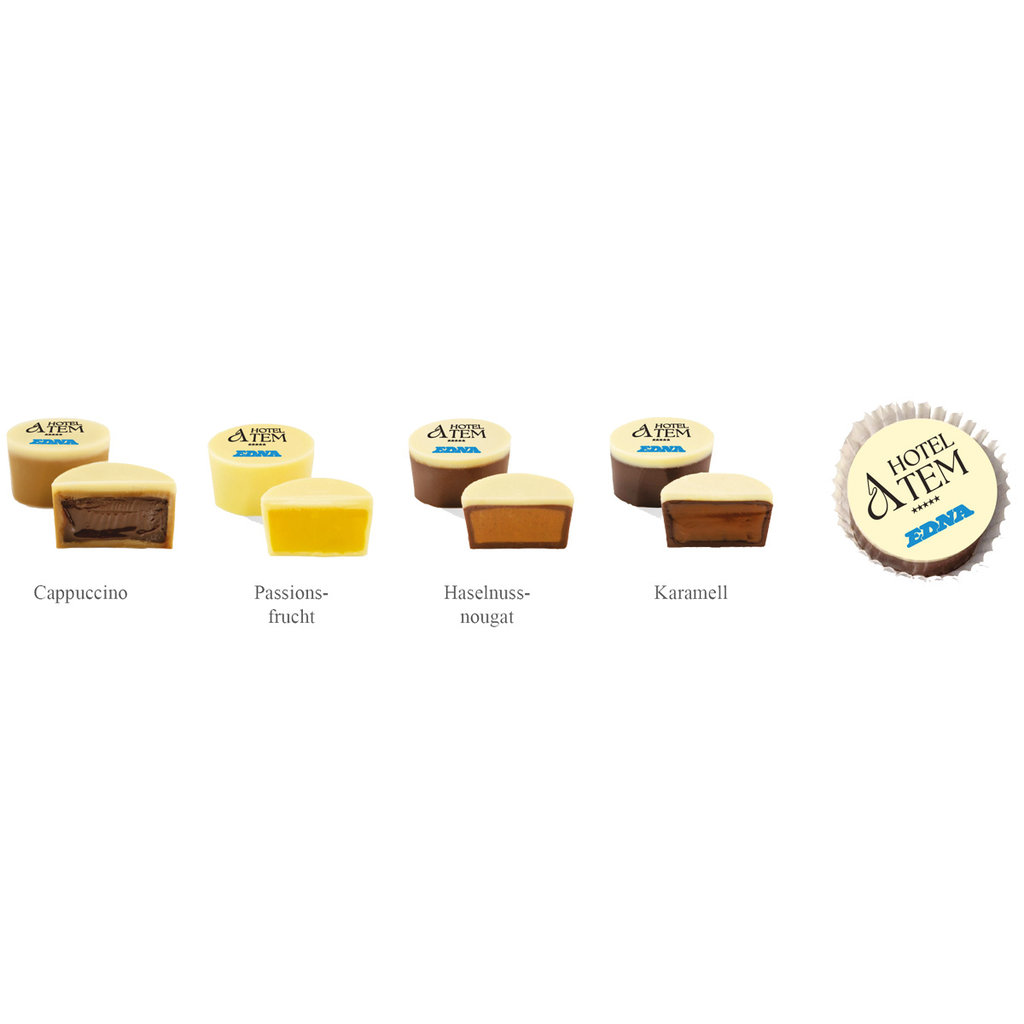 Sorten: Haselnussnougat in Edel-Vollmilchschokolade, Kaffeefüllung in 70% Zartbitterschokolade, Karamell in 70% Zartbitterschokolade, Passionsfruchtfüllung in weißer belgischer Schokolade