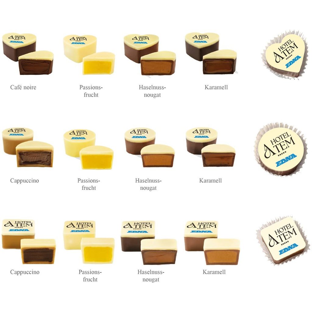 Sorten: Haselnussnougat in Edel-Vollmilchschokolade, Kaffeefüllung in 70% Zartbitterschokolade, Karamell in 70% Zartbitterschokolade, Passionsfruchtfüllung in weißer belgischer Schokolade