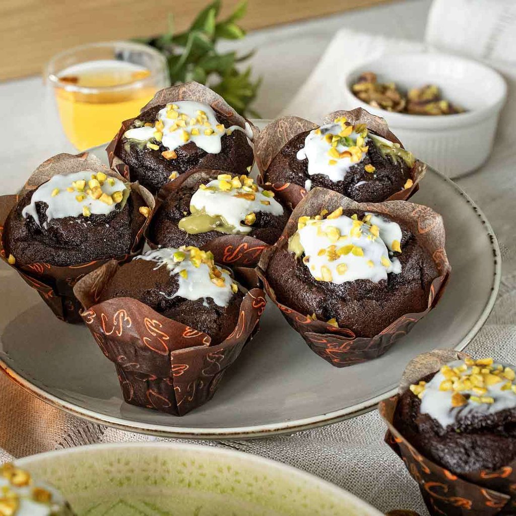 Dieser Premium-Schoko-Pistazien-Muffin vereint saftigen Schokorührteig mit einer cremigen Pistazienfüllung im Kern. Dekoriert mit einer hellen Glasur und fein gehackten Pistazien als Topping, bietet dieser Midsize-Muffin ein harmonisches Zusammenspiel aus Schokolade und Pistazie.