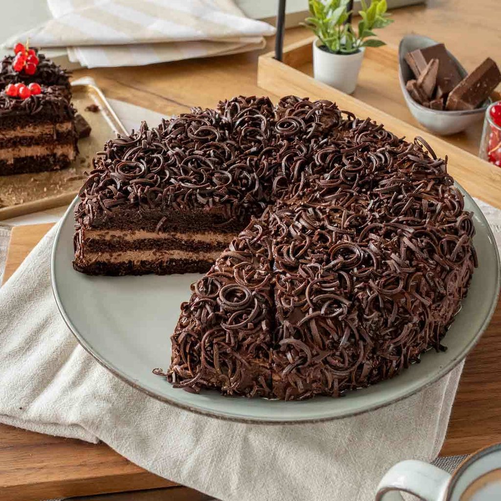Diese bereits in 14 gleich große Stücke vorgeschnittene Schokoladentorte vereint saftigen, dunklen Biskuit mit einer herrlich cremigen Schokoladenfüllung. Veredelt mit dekorativen Schokoladen-Swirls überzeugt sie durch ihren intensiven Geschmack und ihre ansprechende Optik – ein Highlight auf jedem Kuchenbuffet.