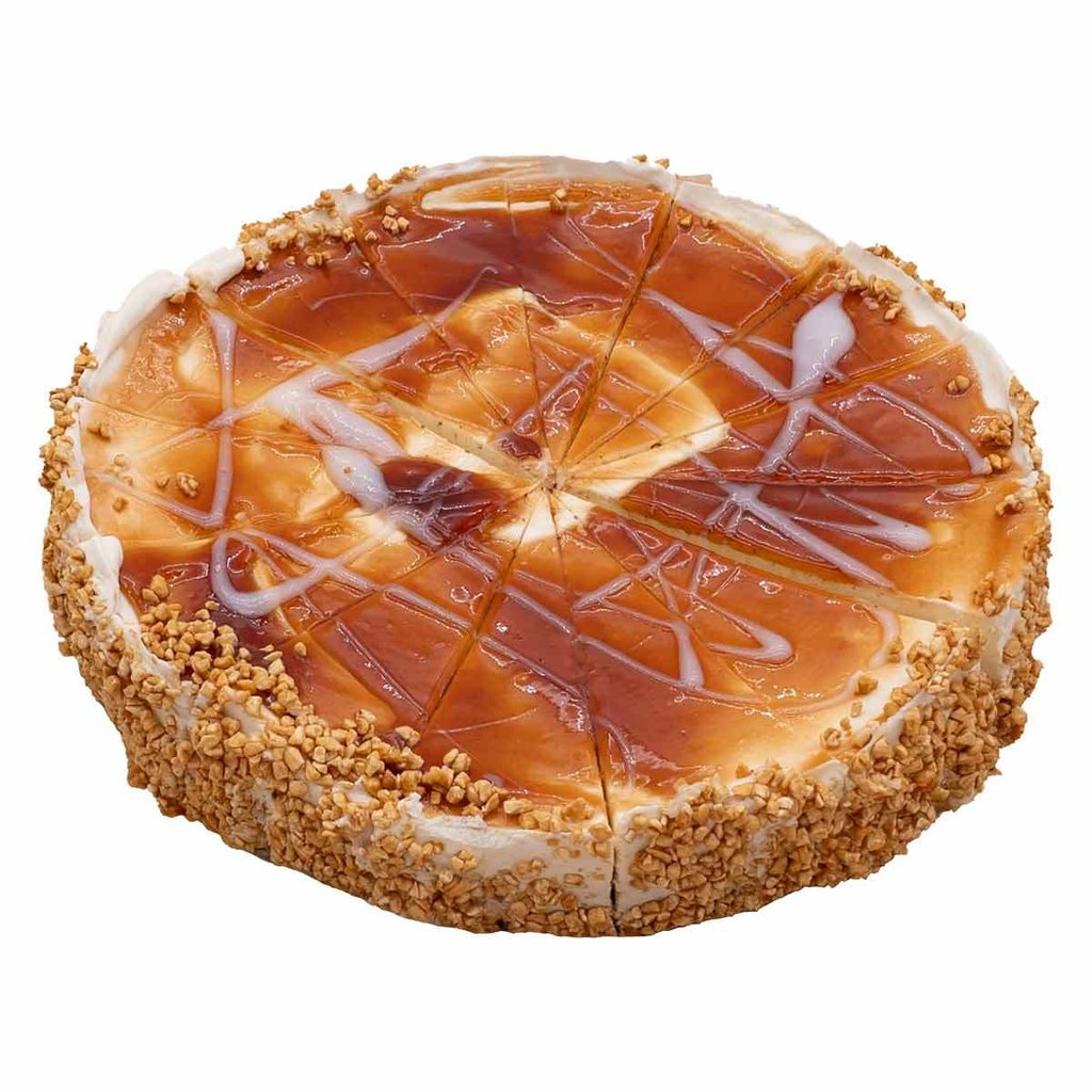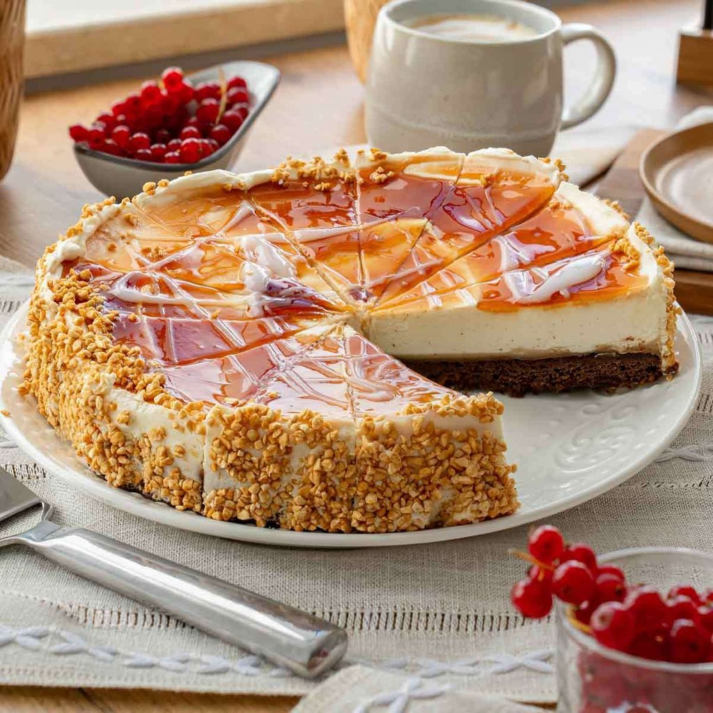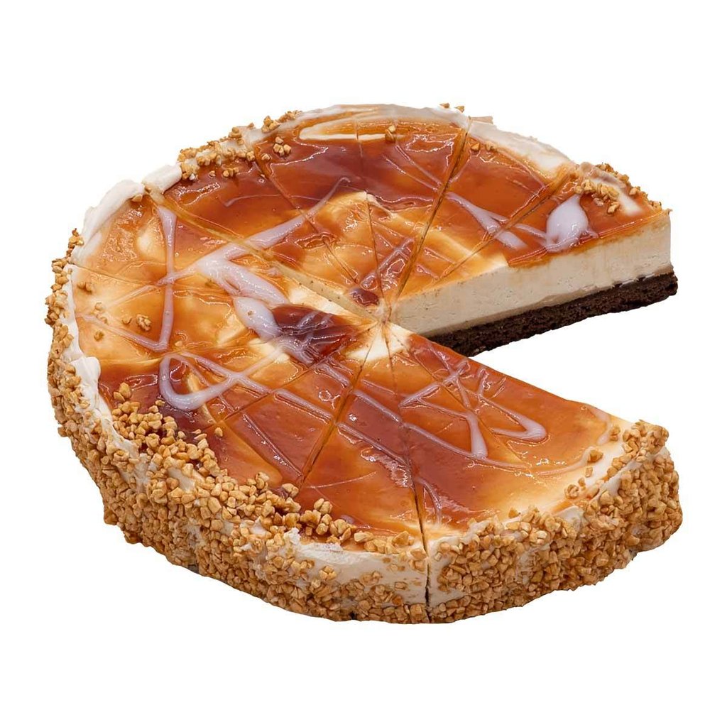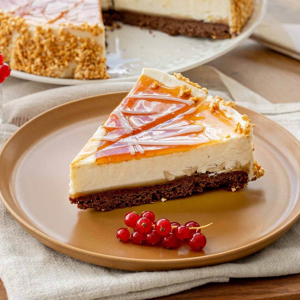 Auf einem saftigen, dunklen Schokoladen-Biskuit liegt eine Schicht Erdnusscreme, kombiniert mit einer cremigen Füllung und veredelt mit weißer Schokolade. Getoppt mit Karamell-Icing und karamellisierten Reiscrisps ist diese bereits vorgeschnittene Torte ein unwiderstehliches Highlight - cremig, schokoladig und karamellig zugleich. Ein besonderes Gechmackserlebnis!