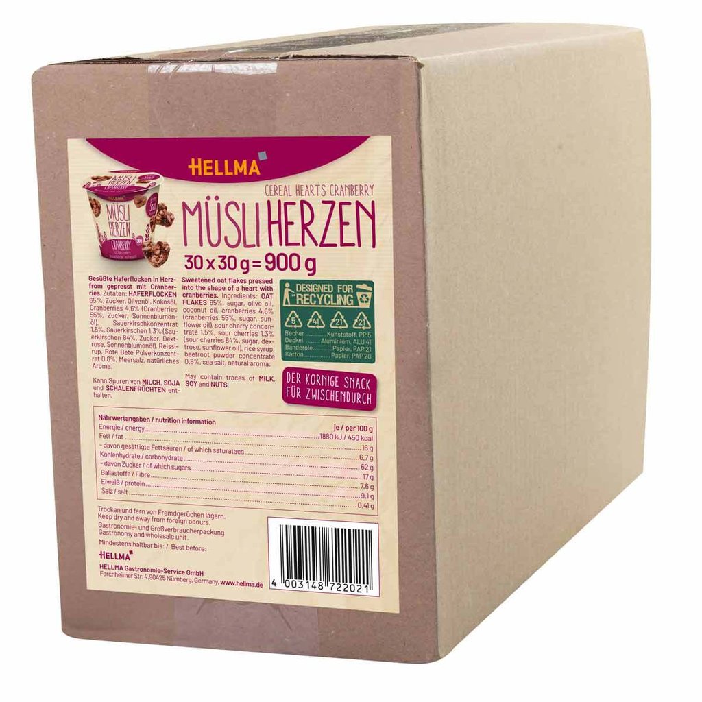 Gesunde Müsli-Herzen mit fruchtigen Cranberry-Stückchen. Im praktischen "to go" Becher als leckerer Snack für zwischendurch ebenso wie zum Frühstück jederorts bestens geeignet!