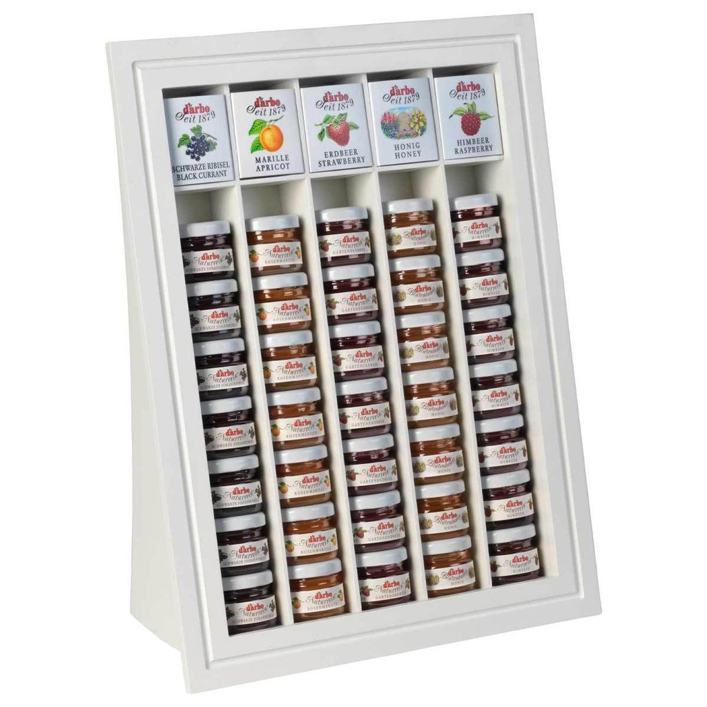Der elegante Aufsteller aus Holz wurde speziell für die Mini-Gläschen aus dem Hause Darbo hergestellt. Das edle Weiß passt perfekt an jedes Buffet und ergibt somit ein harmonisches Bild.