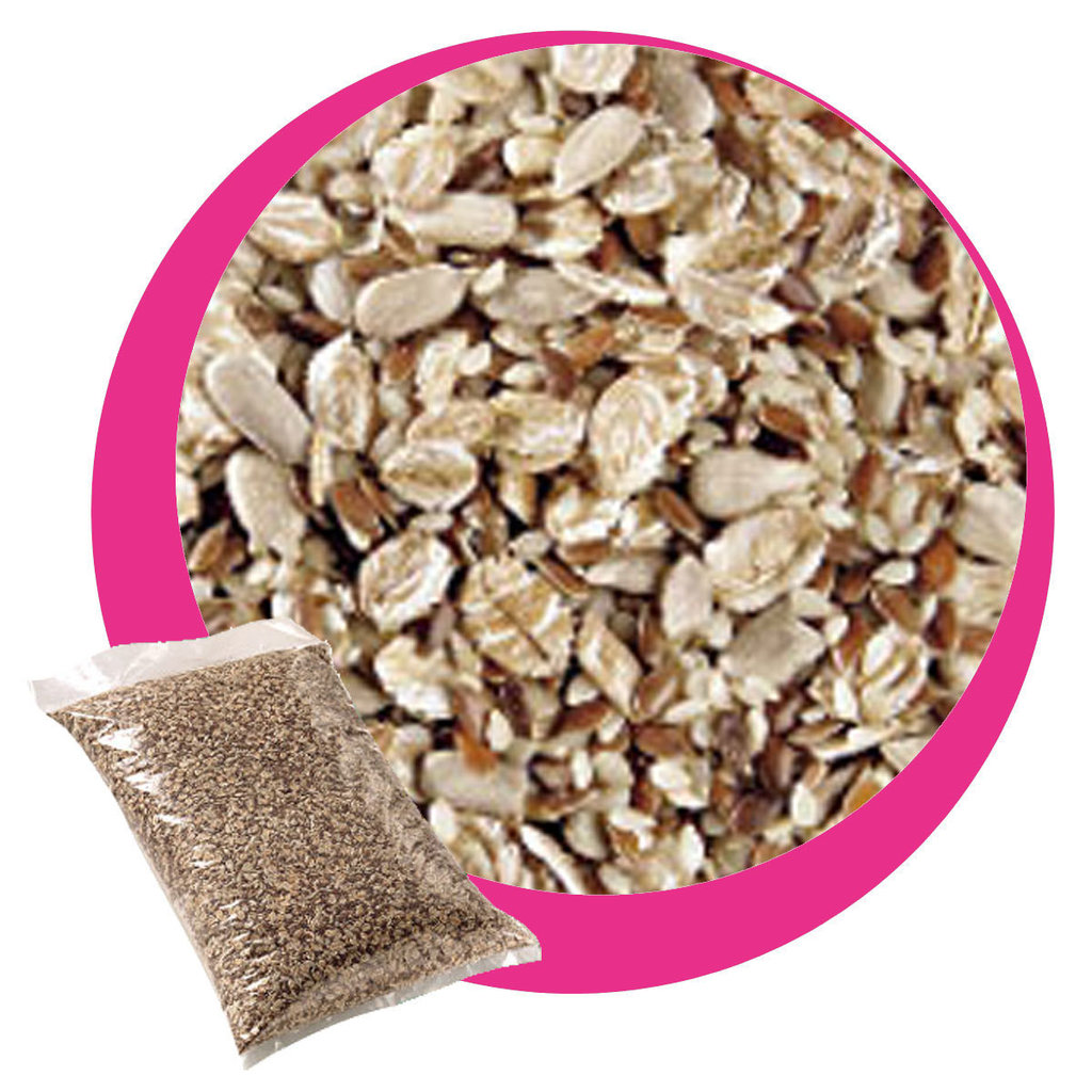 In unserer Körnermischung verwenden wir nur die beste Qualität an Sonnenblumenkernen, Sesam, braunen Leinsamen und Roggenflocken.