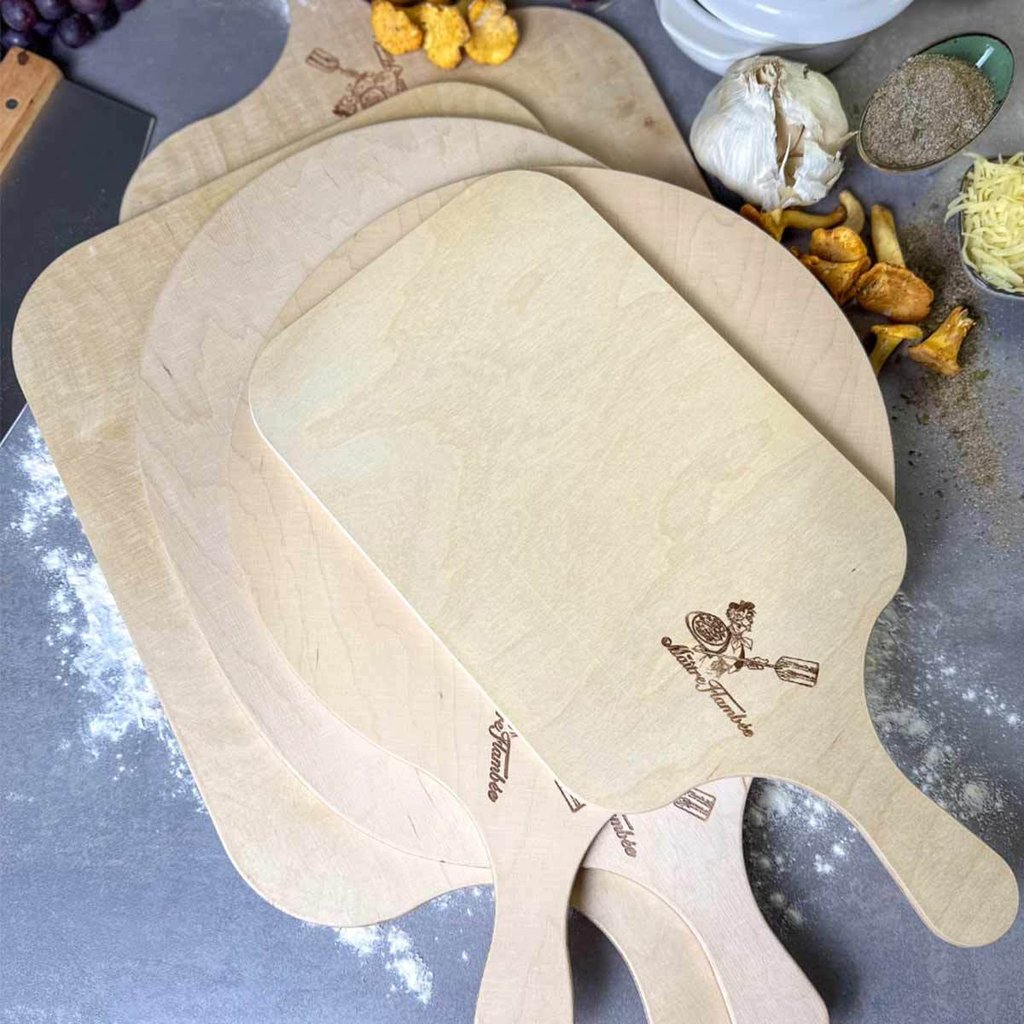 Diese runden Holzbretter sind aus feuchtigkeitsbeständigem Multiplex-Birken-Sperrholz hergestellt. Es eignet sich hervorragend für das stilechte Servieren von runden Flammkuchen und lässt sich beidseitig verwenden.