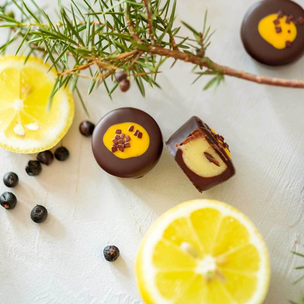 Zucker, Kakaomasse, Kakaobutter, SCHLAGSAHNE, BUTTER, VOLLMILCHPULVER, Apfelsaft, aus, Apfelsaftkonzentrat, Glukosesirup, Grappa, Traubenlikör, Wasser, Jamaica-Rum, Cognac, MAGERMILCHPULVER, Gin, Weinbrand, Limoncello-Likör, Perlwein, Emulgator SOJALECITHIN, Orangenschale, Sultanas, Marc de Champagne, Espresso-Bohnen, (gemahlen), Kakaobohnensplitter, Glukose-Fructosesirup, Speisesalz, Säuerungsmittel Citronensäure, Vanilleextrakt, natürliches Vanillearoma, Orangensaftkonzentrat, Sonnenblumenöl, Geliermittel Pektin, Bourbon-Vanillepulver, pflanzliches Öl(Wacholderbeeren), BUTTERREINFETT, Farbstoff Beta-Carotin