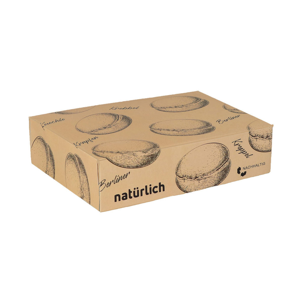 Stabile und ansprechende Verpackung aus Karton für den sicheren Transport von Backwaren wie z.B. Krapfen/Berliner, Fettgebäck, Törtchen, Petits Fours oder Kuchen und Torten.
