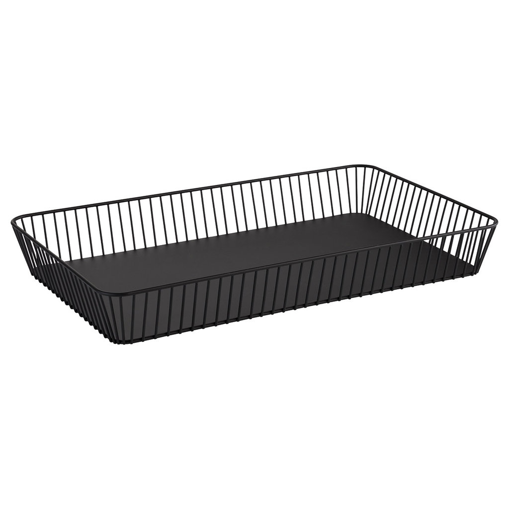 Stylische Körbe im urbanen Look aus pulverbeschichtetem, schwarzem Metalldraht mit einer robusten Drahtstärke von 4 mm. Die Körbe sind stapelbar, spülmaschinenfest und haben in der Gastronorm-Ausführung rutschfeste Füße für sicheren Stand.