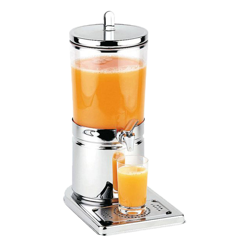 Der spülmaschinenfeste Kunststoffbehälter ist mit einem Deckel aus hochglanzpoliertem Edelstahl sowie einem Kühlakku in Deckel und Fuß ausgestattet. Der hartverchromte, tropffreie Auslaufhahn und der polierte Edelstahlfuß sorgen für eine stilvolle Präsentation. Die Bodenplatte aus poliertem Edelstahl und die Kombination aus hochglanzpoliertem Edelstahl und satiniertem Acryl garantieren eine hygienische und anspruchsvolle Lösung für jedes Buffet.