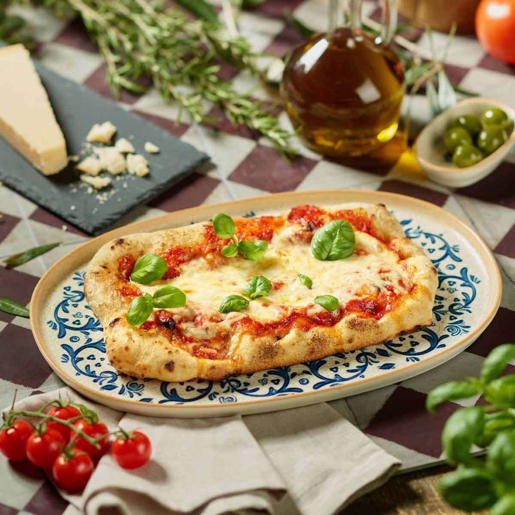 Traditionell nach italienischer Art hergestellte Pinsa mit klassischem Belag aus Tomatensauce, Mozzarella und nativem Olivenöl extra. Ideal für die schnelle Zubereitung in Gastronomie und Foodservice.