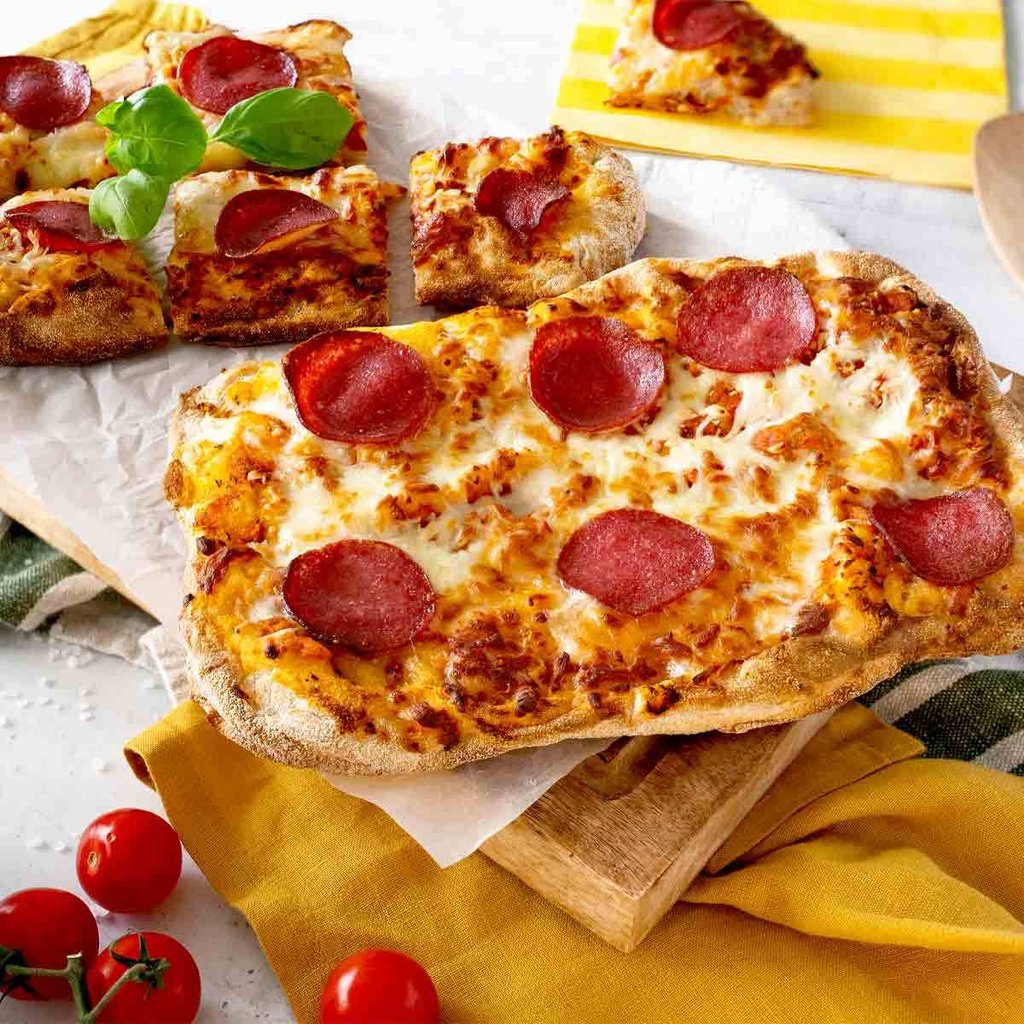 Mini Pinsa mit Tomatensauce, Mozzarella und würziger Salami. Diese vorgebackene Pinsa ist perfekt für schnelle Zubereitung und eignet sich für Gastronomie und Imbiss. Ideal für eine portionierte Snacklösung oder als Teil eines größeren Menüs.