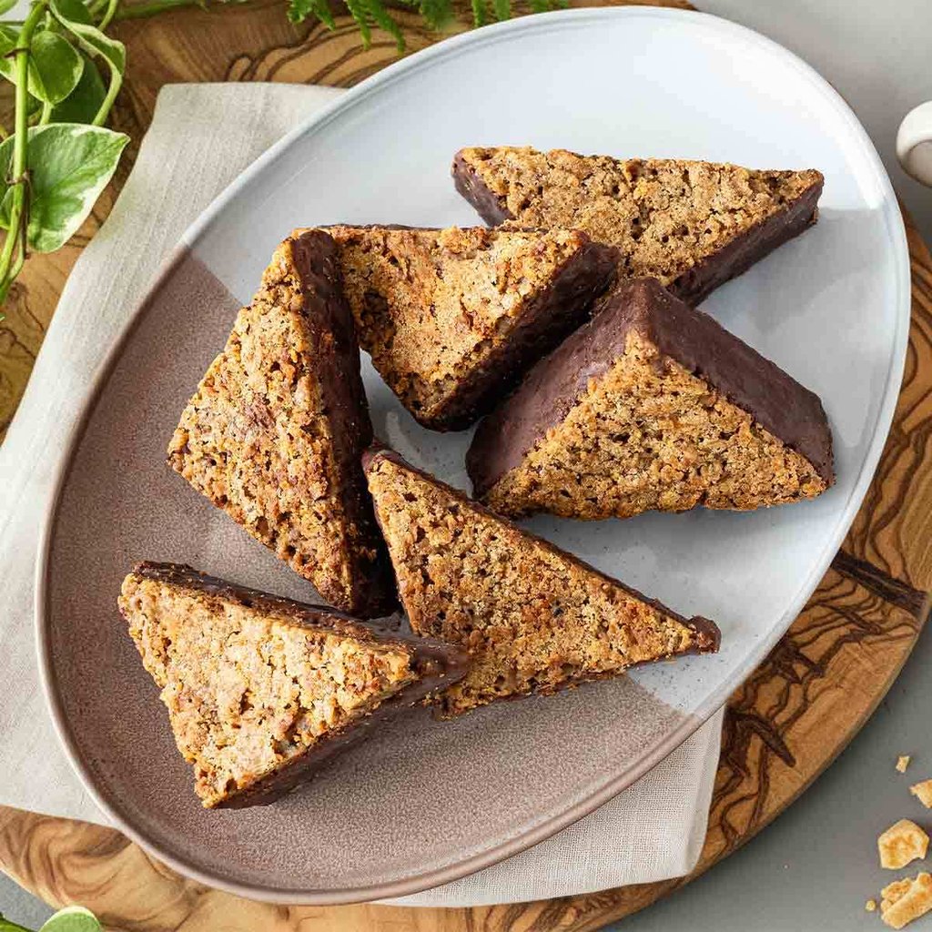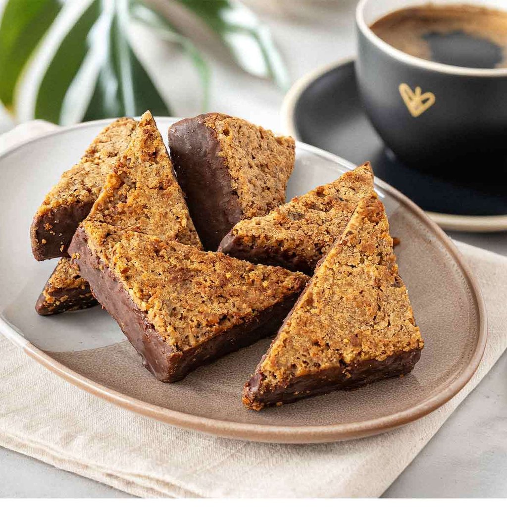 Die saftig-weichen Nussecken begeistern mit einer kuchenähnlichen Textur und einem hohen Nussanteil von 38 % in der Masse. Das besondere Verhältnis von ca. 2/3 aromatischer Nussmasse zu 1/3 zartem Mürbeteigboden sorgt für den perfekten Biss – fein abgestimmt zwischen nussig, süß und schokoladig. Gefertigt nach traditionellem Rezept, ausschließlich mit Zutaten aus kontrolliert biologischem Anbau, eignet es sich perfekt für den Verkauf, das Büro oder die Kaffeetafel.