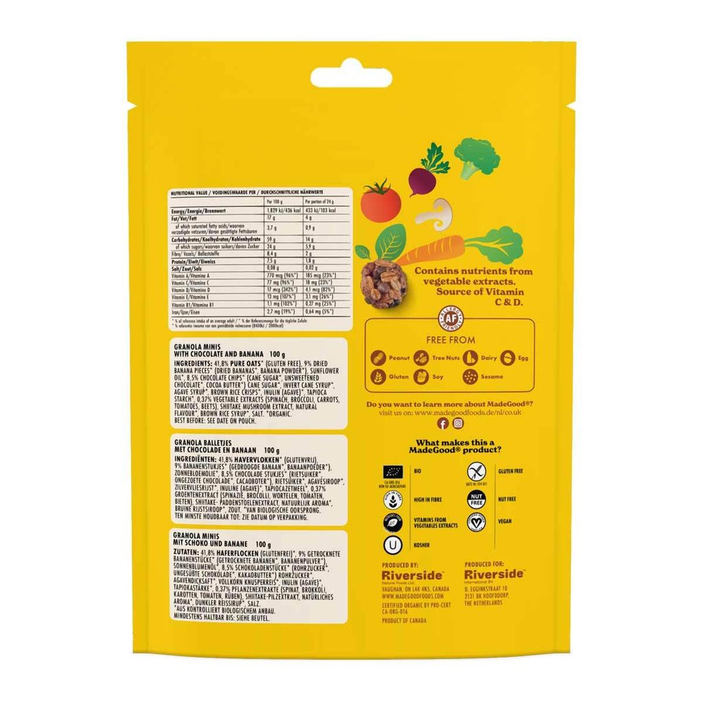 Bio HAFERVOLLKORNFLOCKEN (41,8%), (glutenfrei), Bio Bananenstücke (9%), (getrocknet)(Bio Bananen, (getrocknet), Bio Bananenpulver), Bio Sonnenblumenöl, Bio Schokoladenstücke (8,5%)(Bio Rohrzucker, Bio Schokolade, (ungesüßt), Bio Kakaobutter), Bio Rohrzucker, Bio Agavendicksaft, Bio Knusper Vollkornreis, Bio Inulin, Bio Tapiokastärke, Pflanzenextrakt(Spinat, Brokkoli, Karotten, Tomaten, Rüben), Shiitake Pilzpulver, natürliches Bio Aroma, Bio Reissirup, Speisesalz NL-BIO-01 |