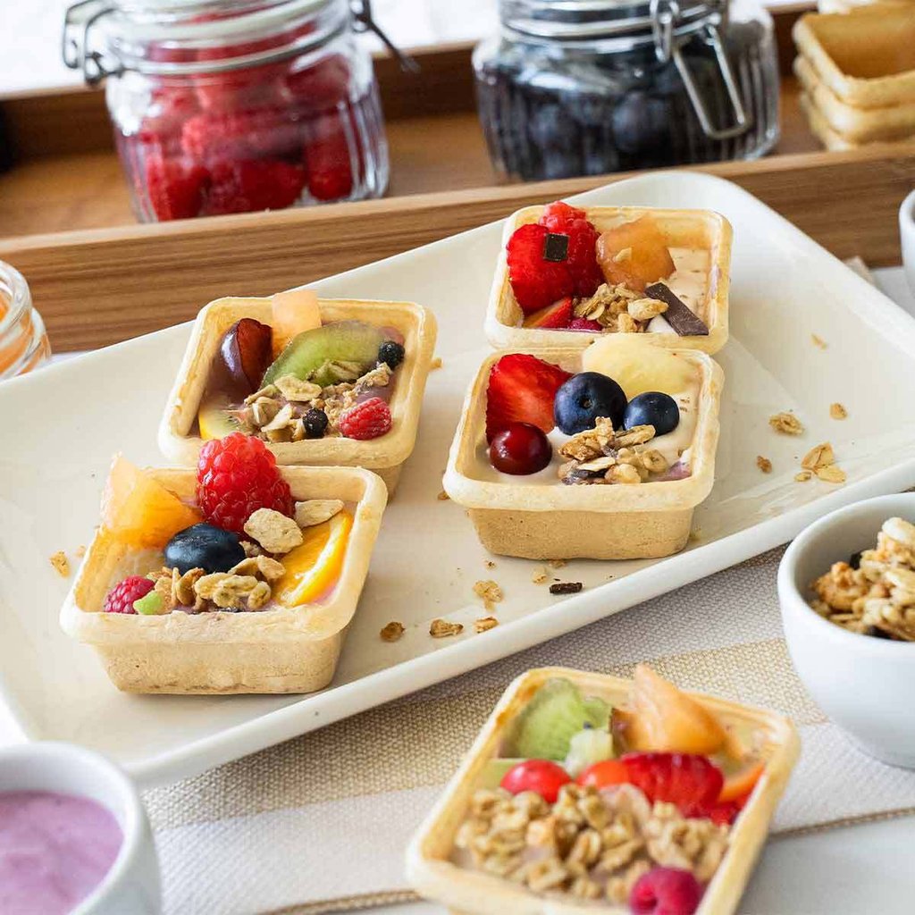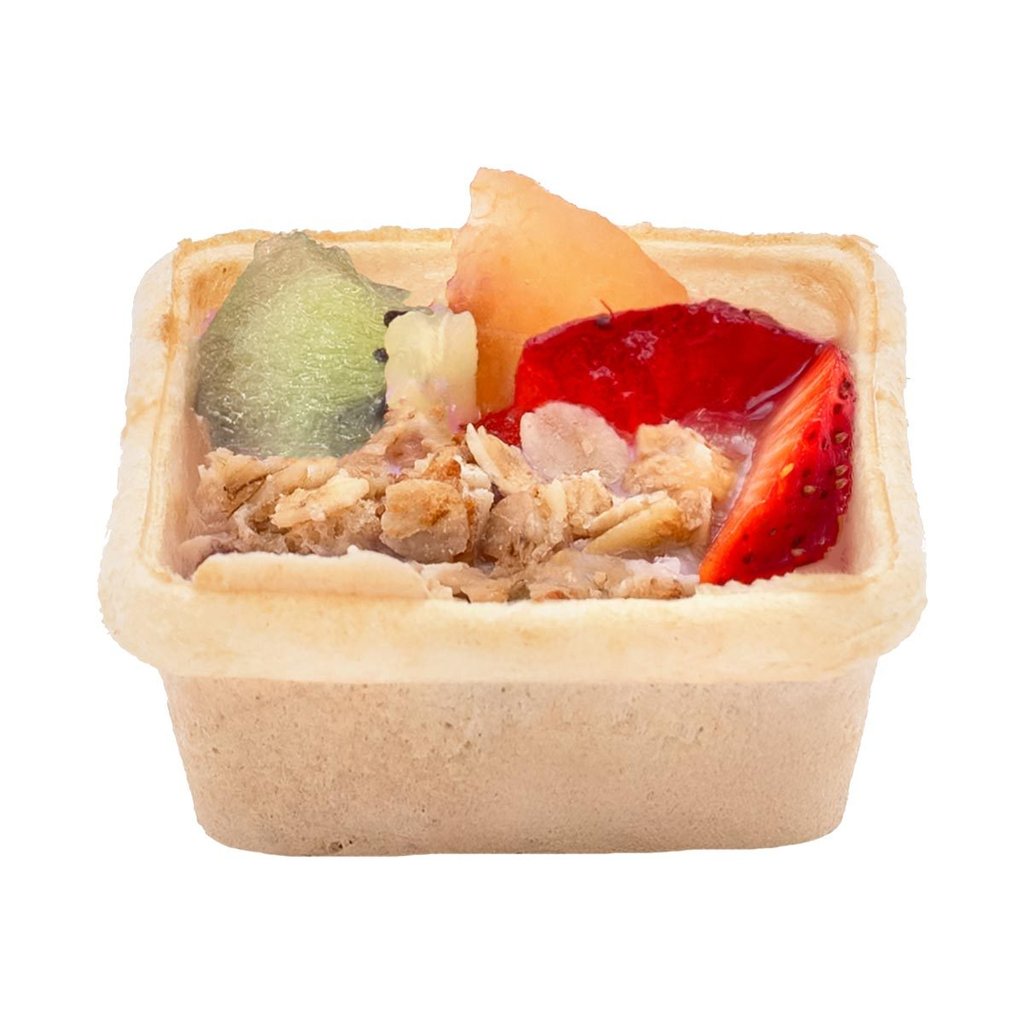 Diese rechteckige Portionswaffel ist die ideale, essbare Alternative zu herkömmlichem Geschirr. Sie eignet sich perfekt als kleines Schälchen für Marmelade, Honig, Aufstriche oder Butter – besonders am Frühstücksbuffet ein praktisches und ansprechendes Extra. Nachhaltig und funktional, spart sie Einweggeschirr und reduziert Abfall.