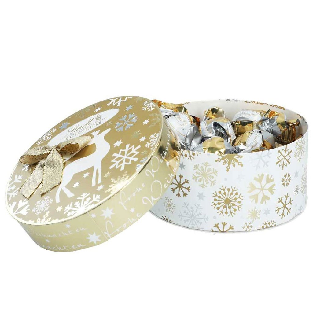 Die stilvolle Geschenkbox enthält Lindt Pralinés aus zartschmelzender Alpenmilchschokolade mit drei weihnachtlichen Füllungen. Das edle Design in Gold und Weiß unterstreicht die Hochwertigkeit dieses Präsents. Durch das integrierte Kärtchen verschaffen sie dem Präsent für Kunden oder Mitarbeiter eine persönliche Note.