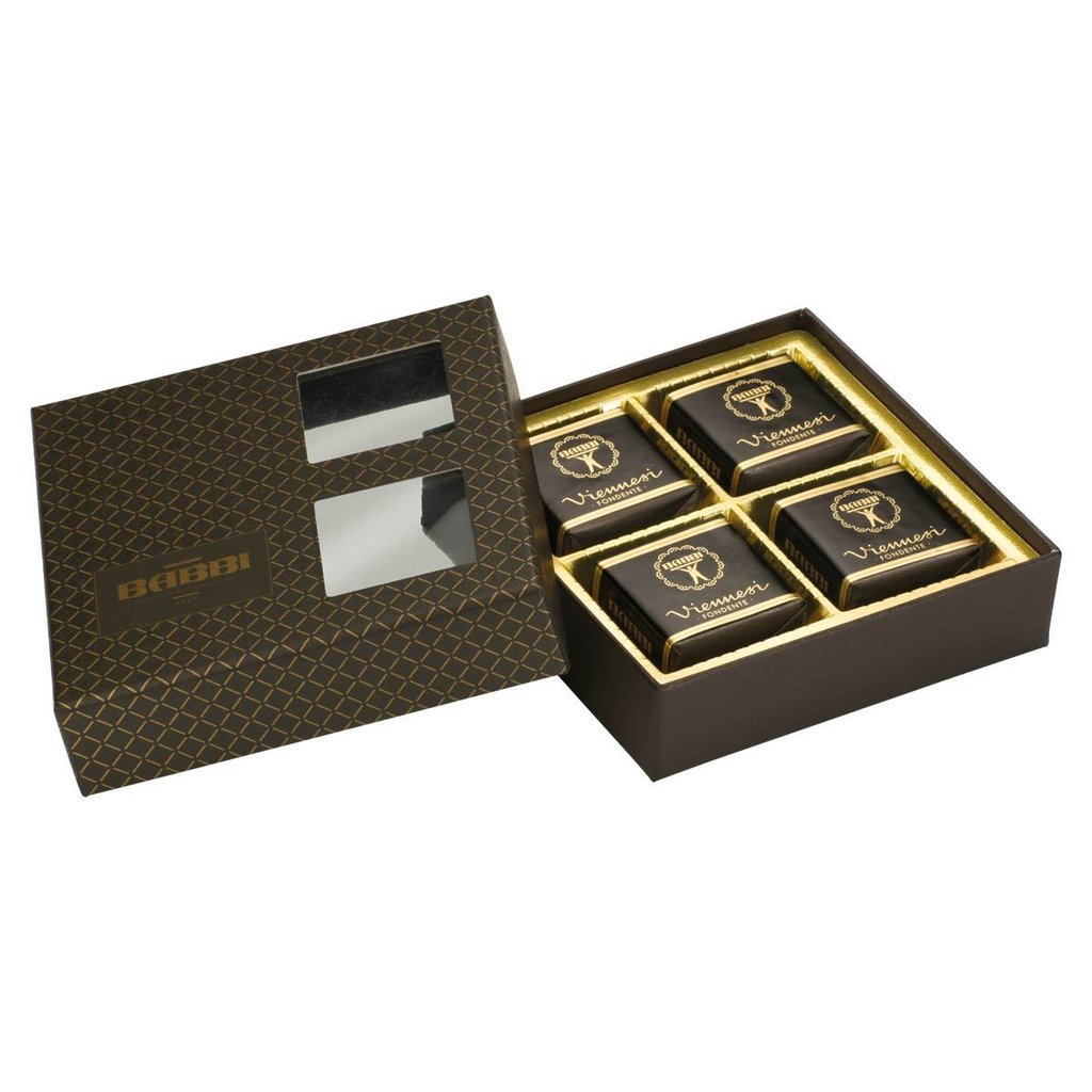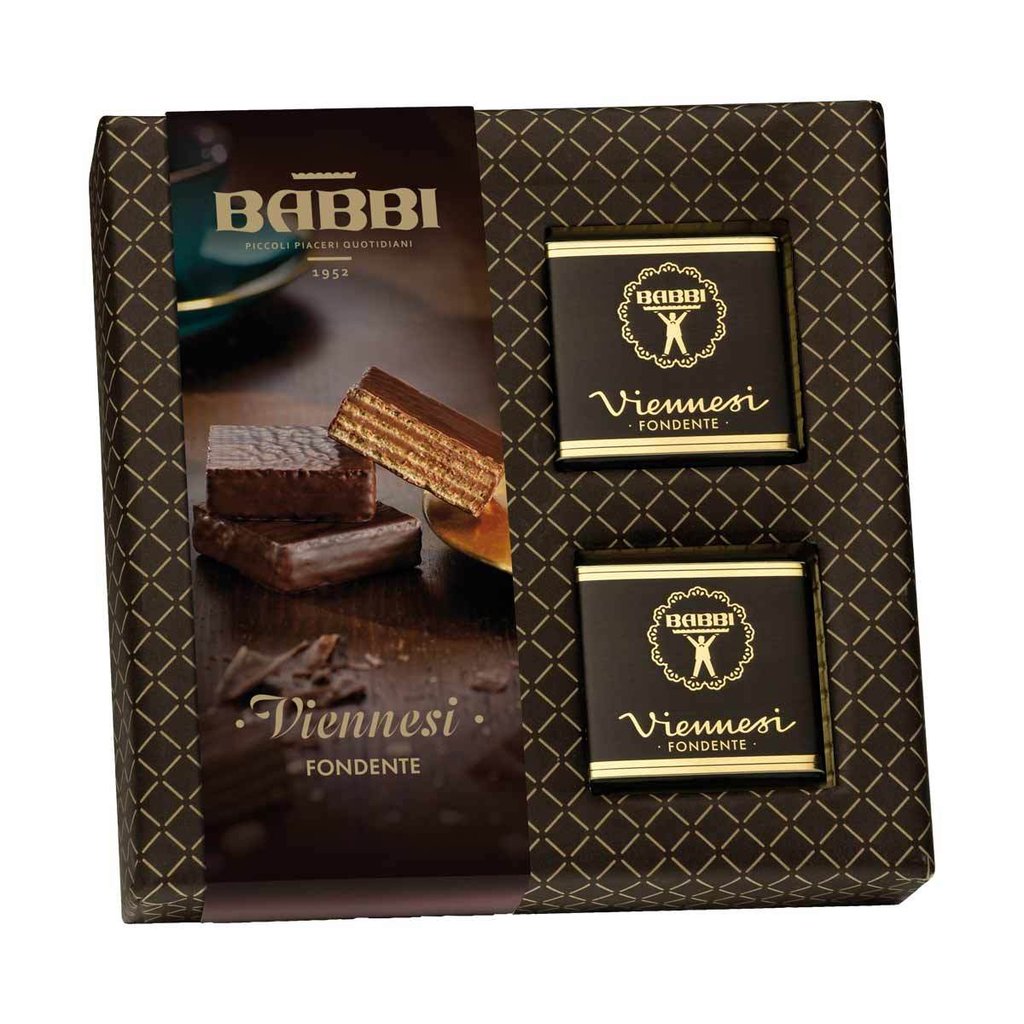 Knusprig-feine Waffeln mit einer cremigen Kakaofüllung und einem Überzug aus edler Zartbitterschokolade. Ob als geschmackvolle Aufmerksamkei oder exklusives Präsent für Gäste: Diese Spezialität begeistert durch ihren intensiven Schokoladengenuss und verleiht jedem Anlass eine elegante Note. Die stilvolle Verpackung macht die Viennesi Fondente zum idealen Produkt für gehobene Gastronomie und Hotellerie.
