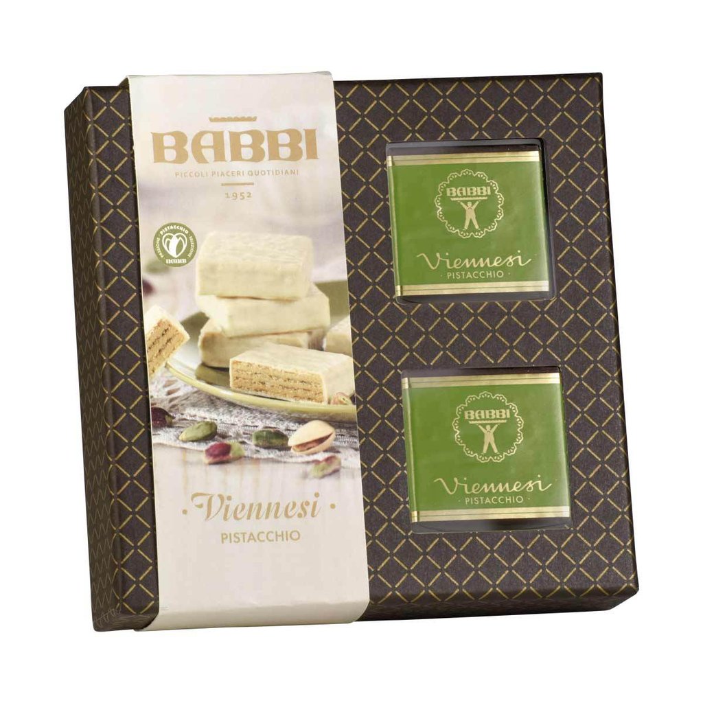 Knusprig-feine Waffeln mit einer edlen Pistaziencreme und einem Überzug aus zarter weißer Schokolade. Sie eignen sich perfekt als kleine Aufmerksamkeit oder besonderes Präsent für Gäste und verleihen jedem Moment eine elegante, genussvolle Note. Die stilvolle Verpackung macht die Viennesi Pistacchio zu einem idealen Produkt für gehobene Hotellerie und Gastronomie.