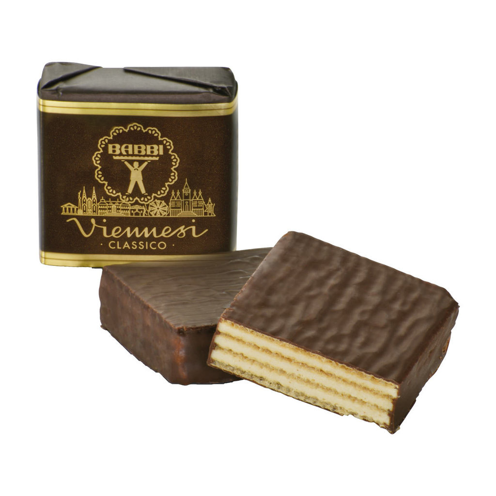 Das praktische Thekendisplay mit Viennesi Classico präsentiert feinste italienische Waffelkreationen in ansprechender Form. Jede einzeln verpackte Spezialität kombiniert eine zart-knusprige Waffel mit cremiger Vanillefüllung und edlem Zartbitterschokoladenüberzug. Ideal zur Präsentation am Empfang, in Cafés oder zur stilvollen Beigabe zum Kaffee.