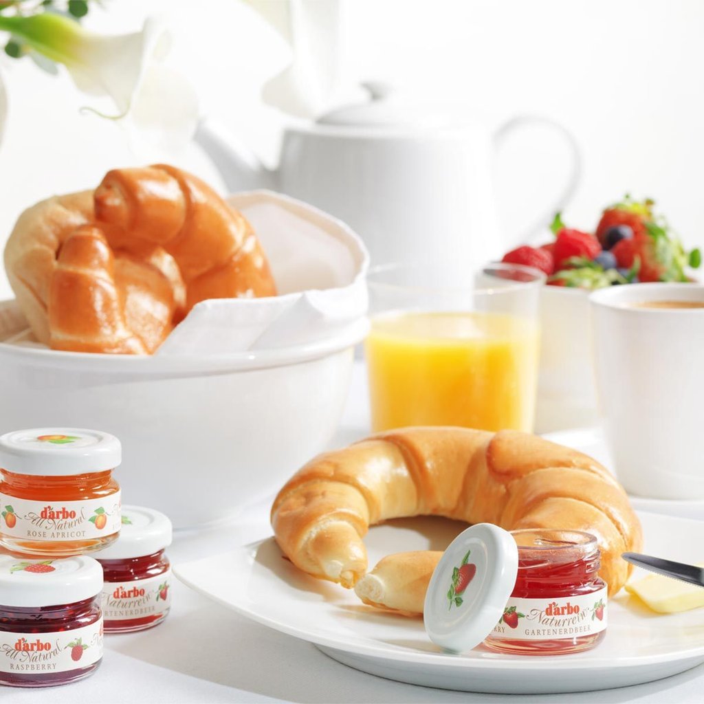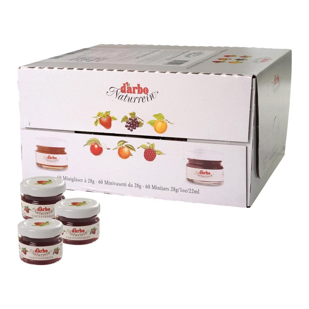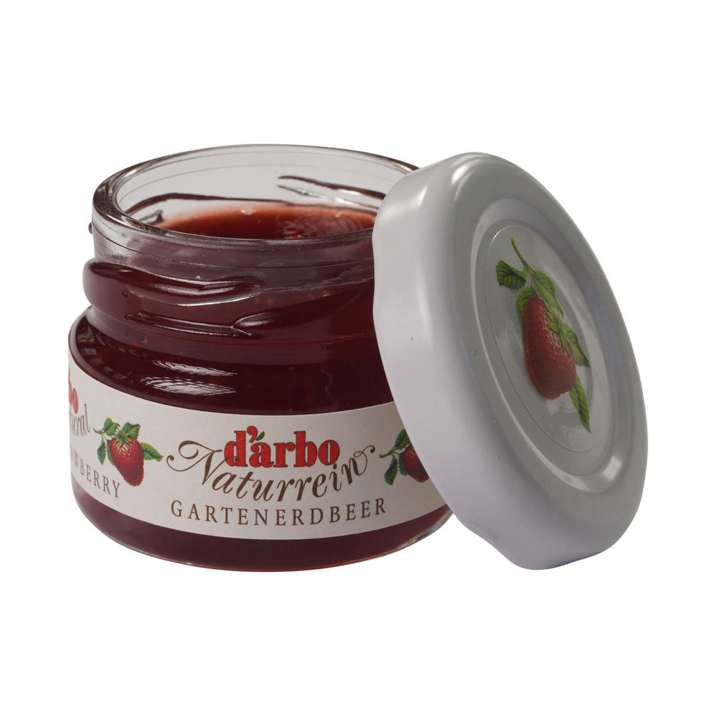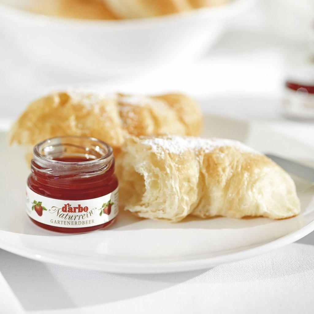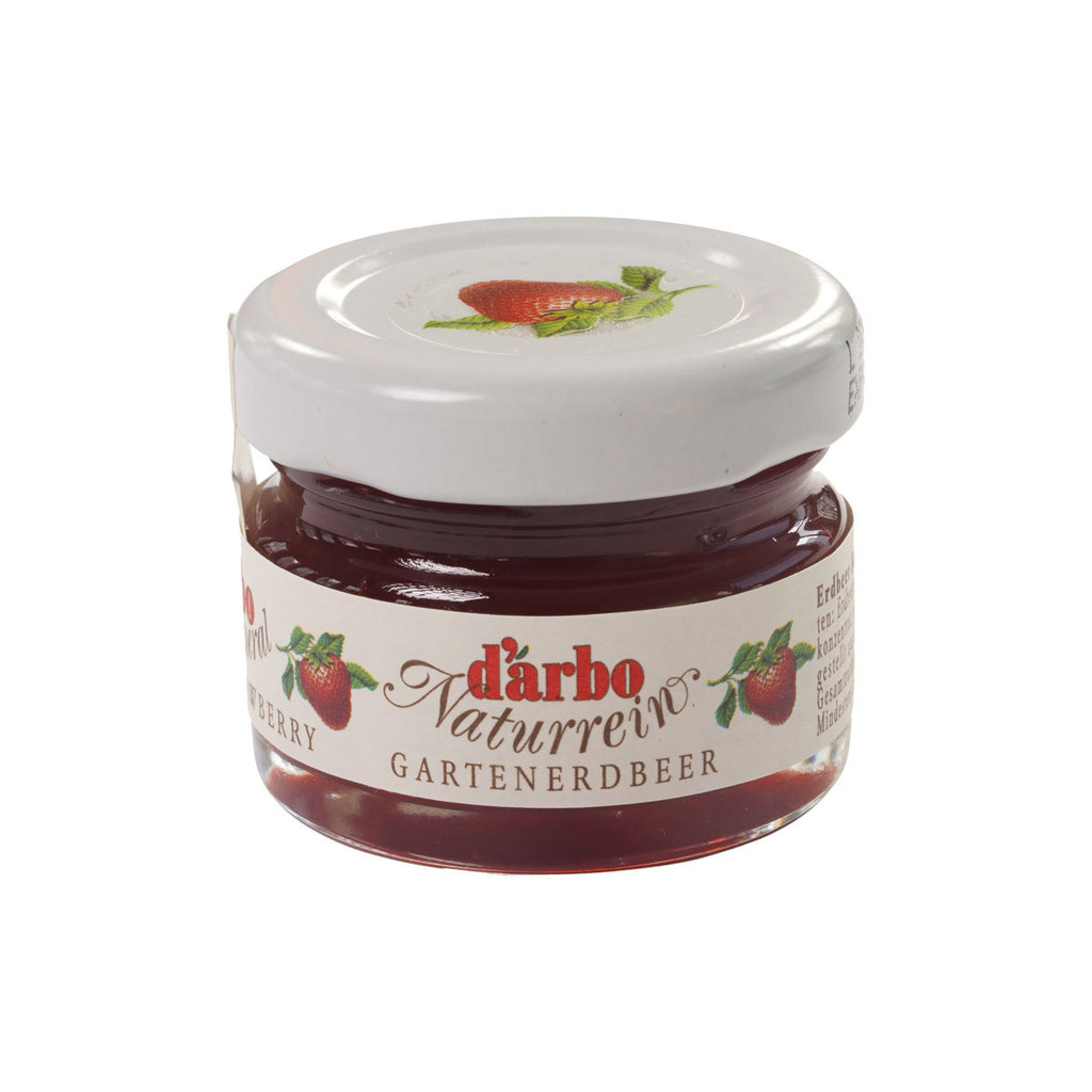 Kräftige Farbe, intensives Aroma und köstlicher Fruchtgeschmack, das ist die Erdbeer Konfitüre von Darbo. Das praktische Minigläschen eignet sich hervorragend am Frühstücksbuffet, somit haben Ihre Kunden und Gäste immer die ideale Menge.