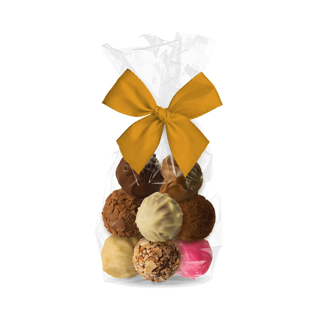 Eine Auswahl an feinsten Trüffelsorten in einer Klarsichtstüte und einer Clipschleife verpackt. Ein tolles Präsent.