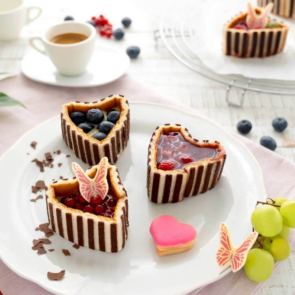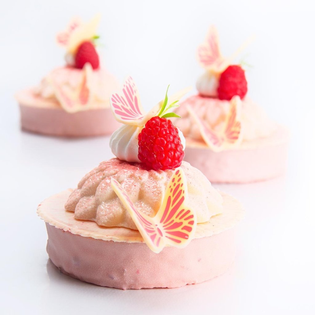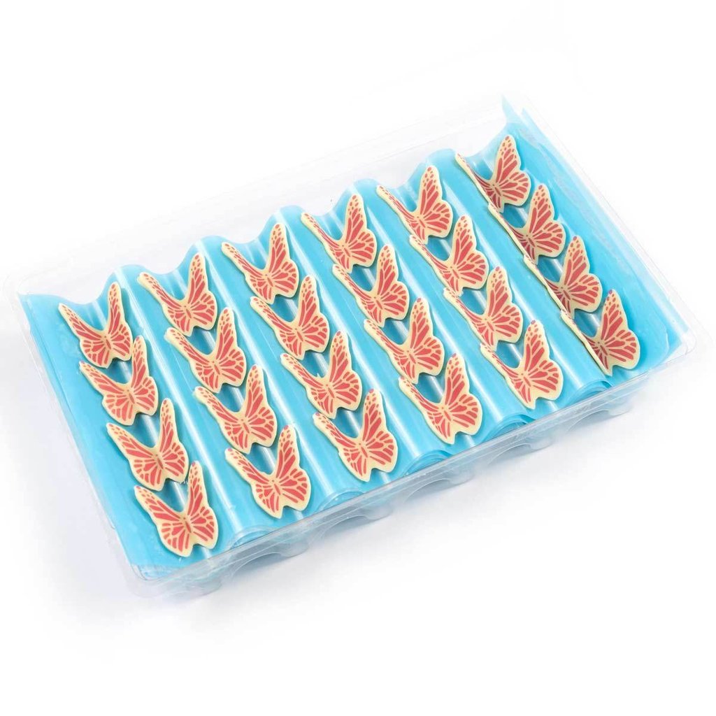 Verwandeln Sie Kuchen, Torten, Gebäck und Desserts mit einem filigranen Schmetterlingsdekor im Handumdrehen in ein ansprechendes Kunstwerk. Das essbare Dekor besteht aus hochwertiger, weißer Schokolade mit pinken Applikationen und zaubert den Frühling auf die Teller Ihrer Kunden und Gäste.