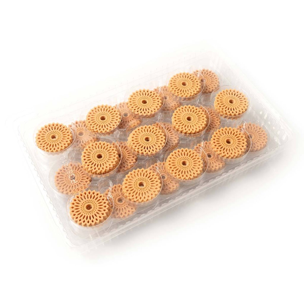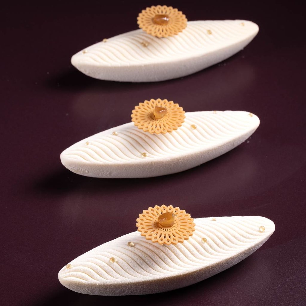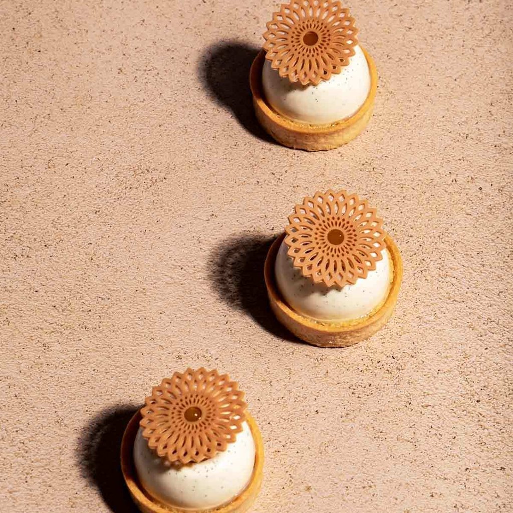 Veredeln Sie Ihre Torten und Desserts mit unserem Blumendekor aus bernsteinfarbener Schokolade. Die Schokolade ist gefärbt und hat den charakteristischen Geruch und Geschmack weißer Schokolade. Das florale Design macht Ihre Speisen zu einem echten Hingucker.