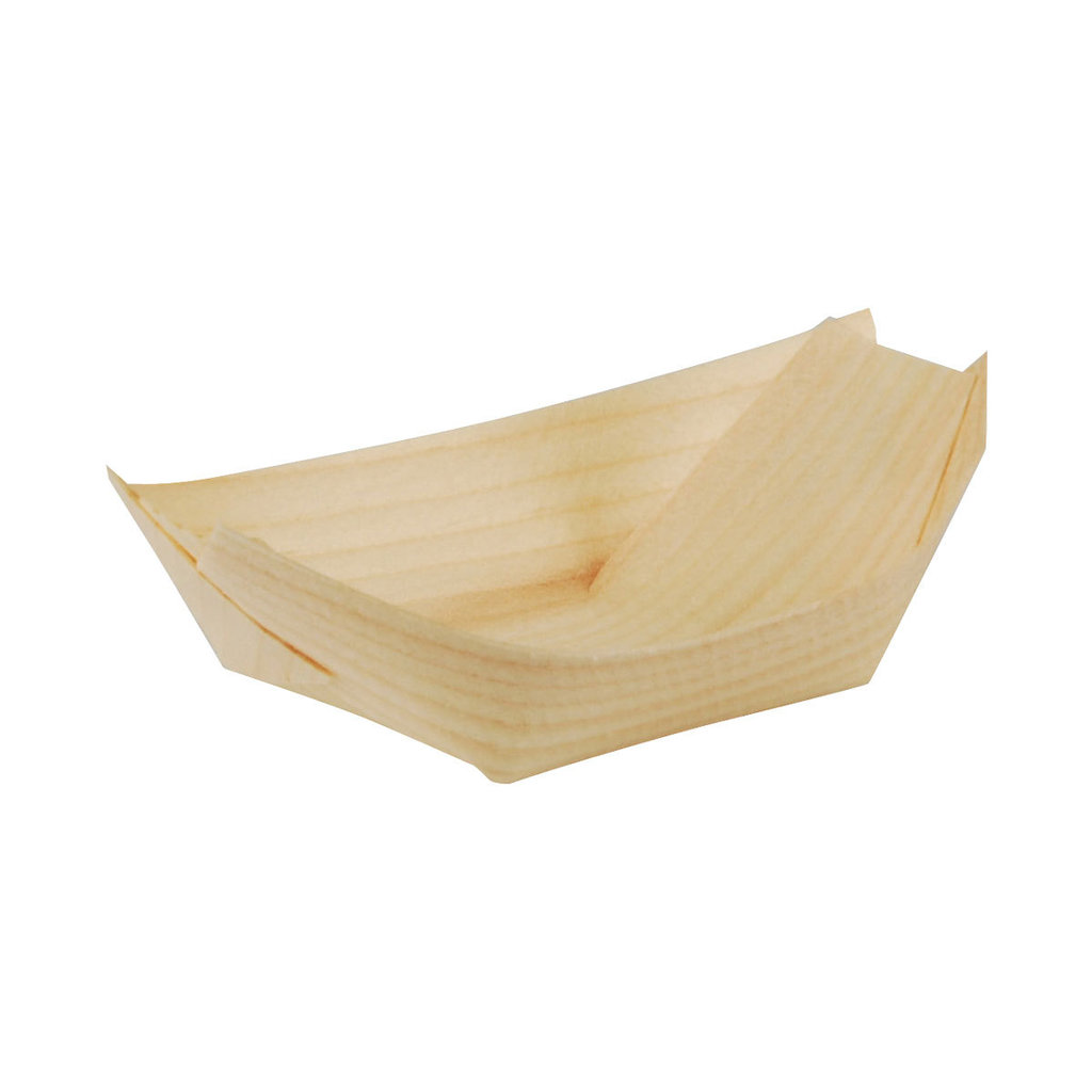 Mit diesen besonderen Holz-Schiffchen gelingt Ihnen im Handumdrehen eine besonders ansprechende Warenpräsentation. Servieren Sie saftige Spieße, köstliches Sushi oder Ihre Eigenkreation. Die kleinen Boote sind trotz ihrer schmalen Struktur besonders robust und können zudem vollständig kompostiert werden.