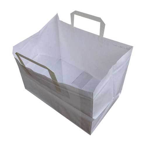 Diese breite Papiertasche eignet sich ideal für den Transport von Torten, Kuchen und Lunchboxen. Das neutrale, weiße Papier macht die Tasche stabil und mehrfach verwendbar.