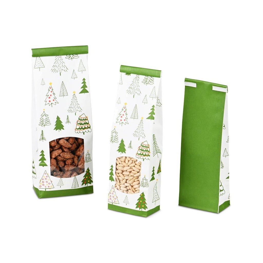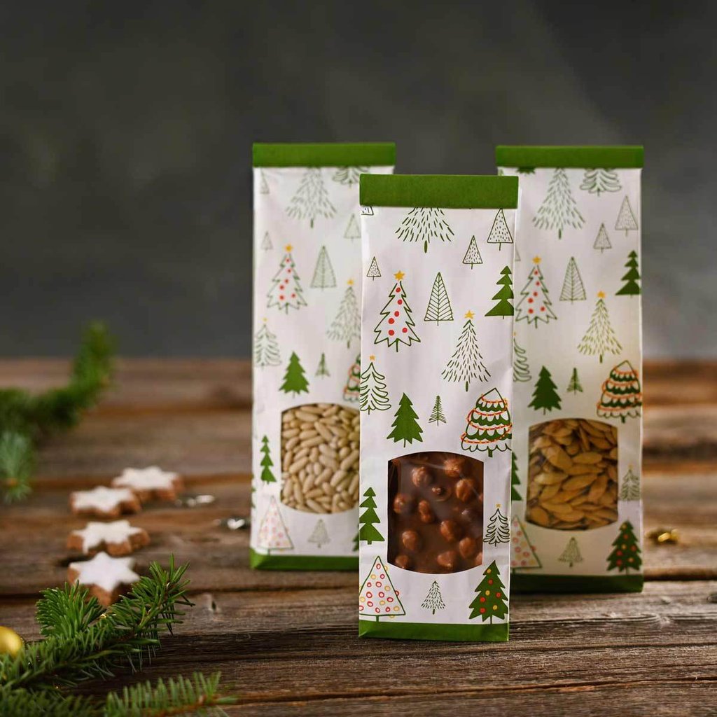 Verpacken Sie in diesem Blockbeutel im Weihnachtsdesign Ihre Leckereien, wie gebrannte Mandeln, Schokolade und Weihnachtsplätzchen, für Ihre Kunden.