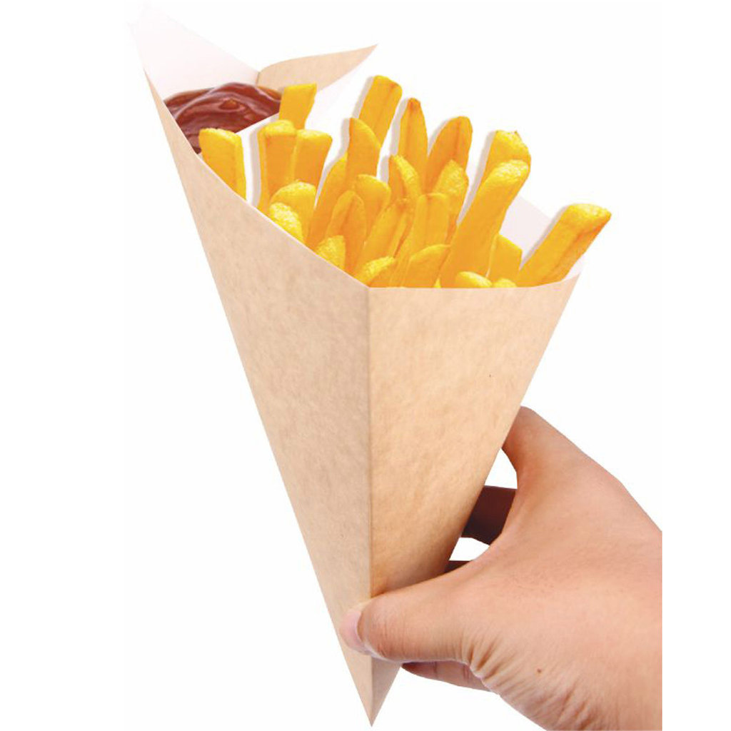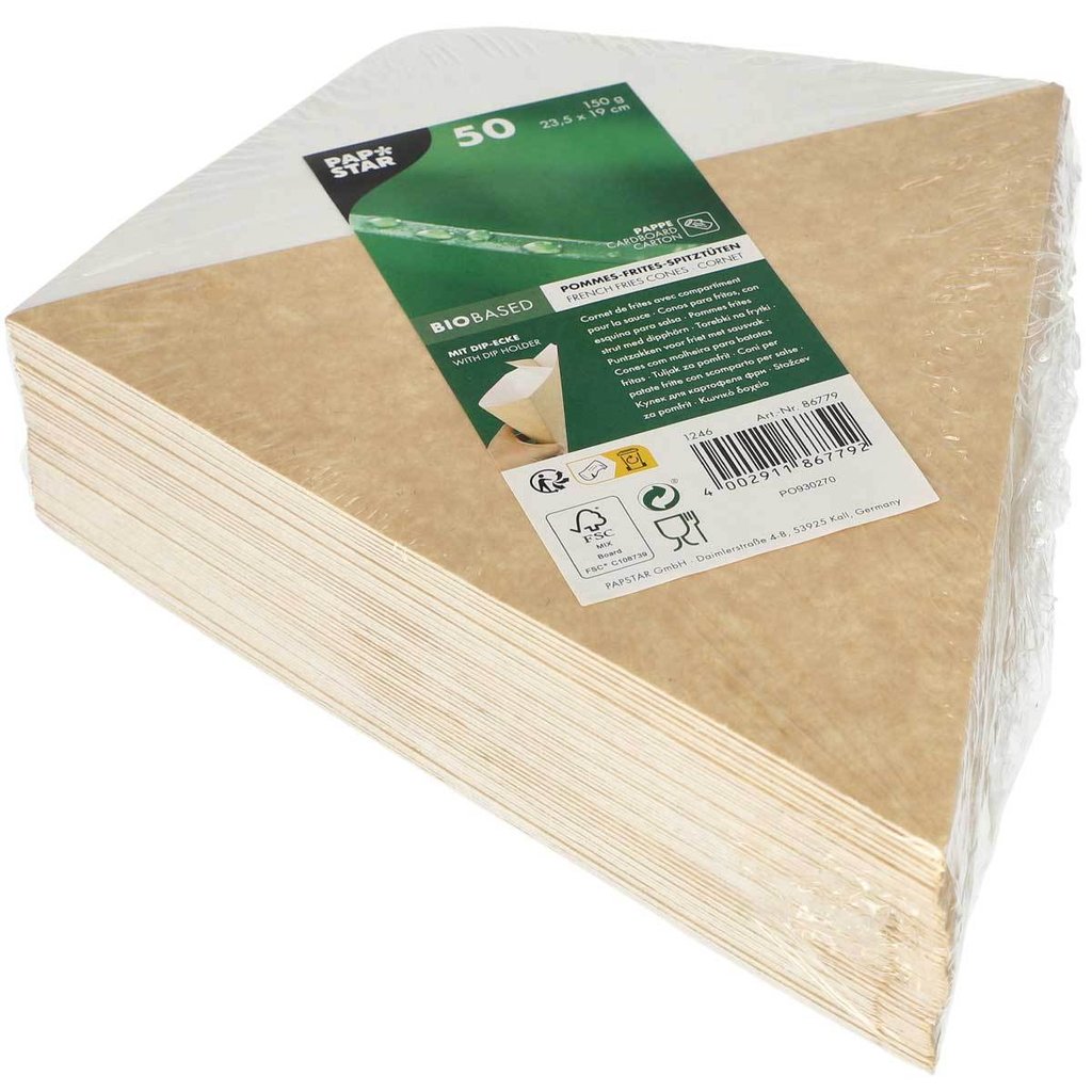 Die Spitztüte ist eine praktische Verpackungslösung für den to-go Bereich. Die Dip-Ecke nur ausklappen, so können Pommes und Dip gleichzeitig serviert werden. Ihre Kunden können somit auch unterwegs kleckerfrei Genießen.