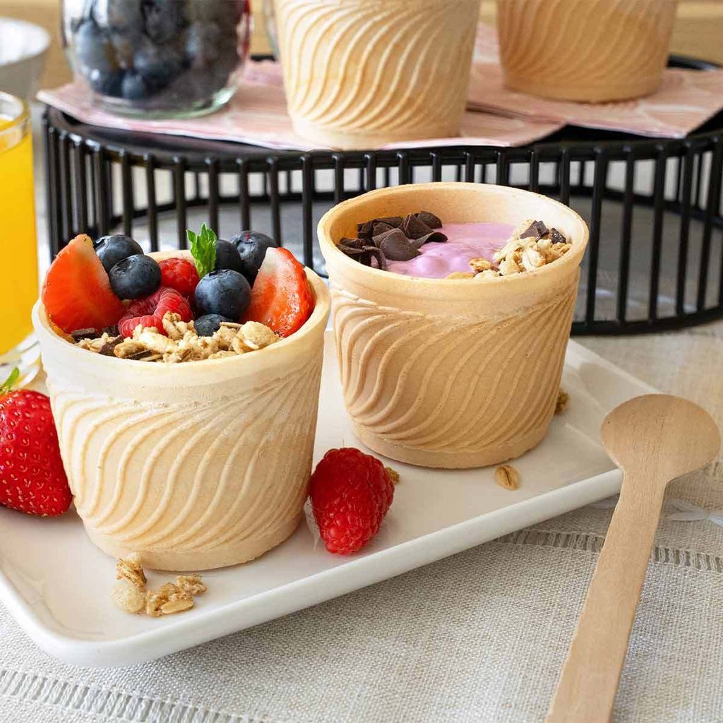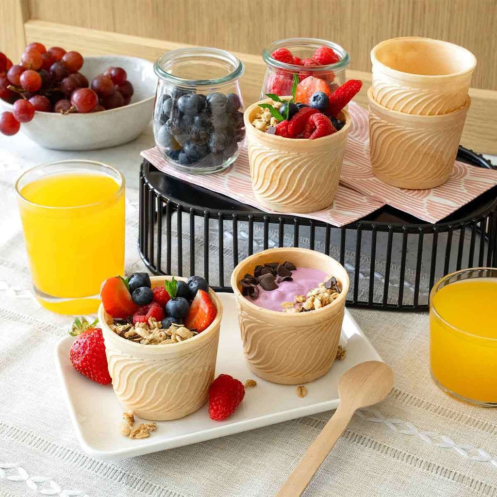 Bieten Sie Ihren Kunden leckeres Eis, Fruchtsalate, Snacks, Saucen, Konfitüren, Dips und Fingerfood aus essbaren Bechern. Die Becher sind aus einer leicht süßen Waffel hergestellt.