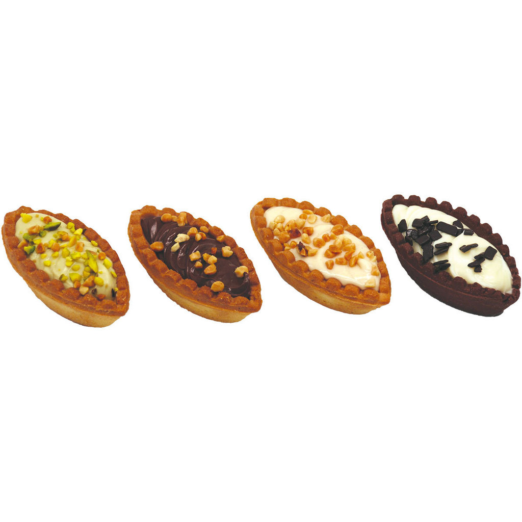Genießen Sie diese feinen Mürbeteigschiffchen, die mit vier unterschiedlichen Füllungen begeistern: Nuss/Gianduja, Milchcreme, Schokoladencreme und Pistazien. Goldbraun gebacken und mit einer weichen, cremigen Füllung versehen, die je nach Sorte durch verschiedene Cerealien für eine angenehme Textur sorgt. Ideal für gehobene Dessertbuffets, Cafétheken oder als elegante Kaffee-Beilage.