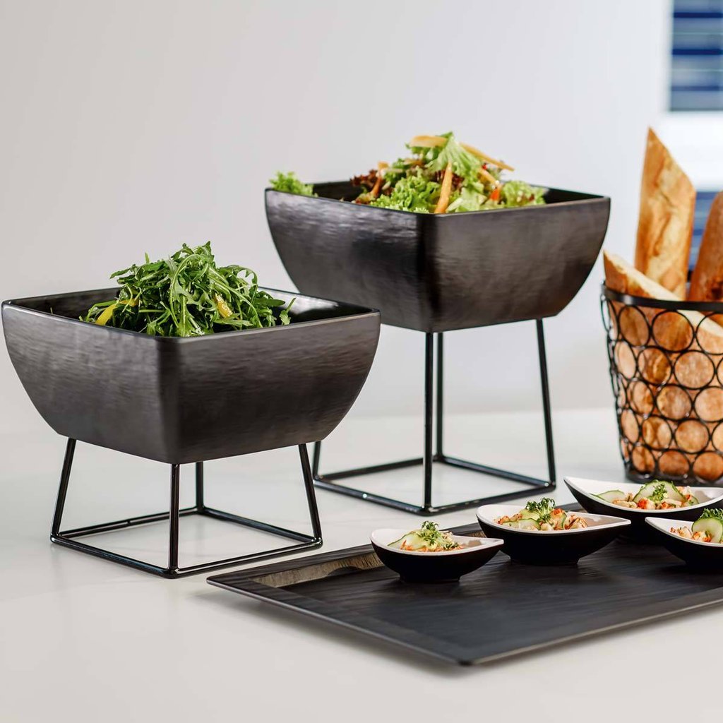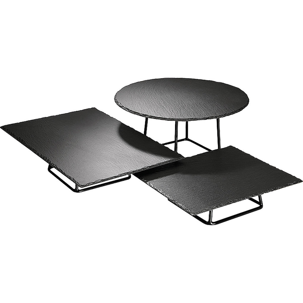 Der stabile Metallständer verfügt über eine schwarze, rutschfeste Gummiauflage und eignet sich ideal zum Aufstellen von Platten, Tabletts und Schalen. Er ist stapelbar und spülmaschinenfest.