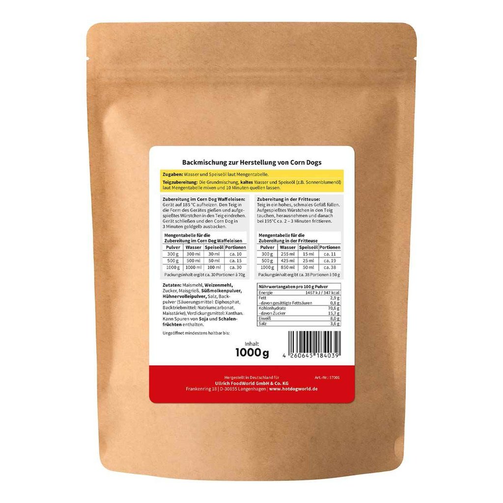 Diese Backmischung nach amerikanischer Rezeptur sorgt für perfekte Corn Dogs – außen knusprig, innen saftig. Dieser Mix eignet sich sowohl für den Corn Dog Waffle Maker Art. 62011 als auch zum Frittieren und liefert stets gleichbleibend gute Ergebnisse. Einfach mit Wasser und Öl anrühren, quellen lassen und los geht’s.